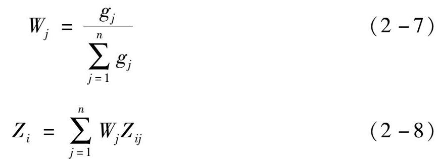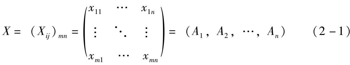 式(2-1)中, X ij ( i =1,2,…, m ; j =1,2,…, n )表示第 i 个对象的第 j 项指标值, A j ( j =1,2,…, n )为第 j 项指标的列向量数据。