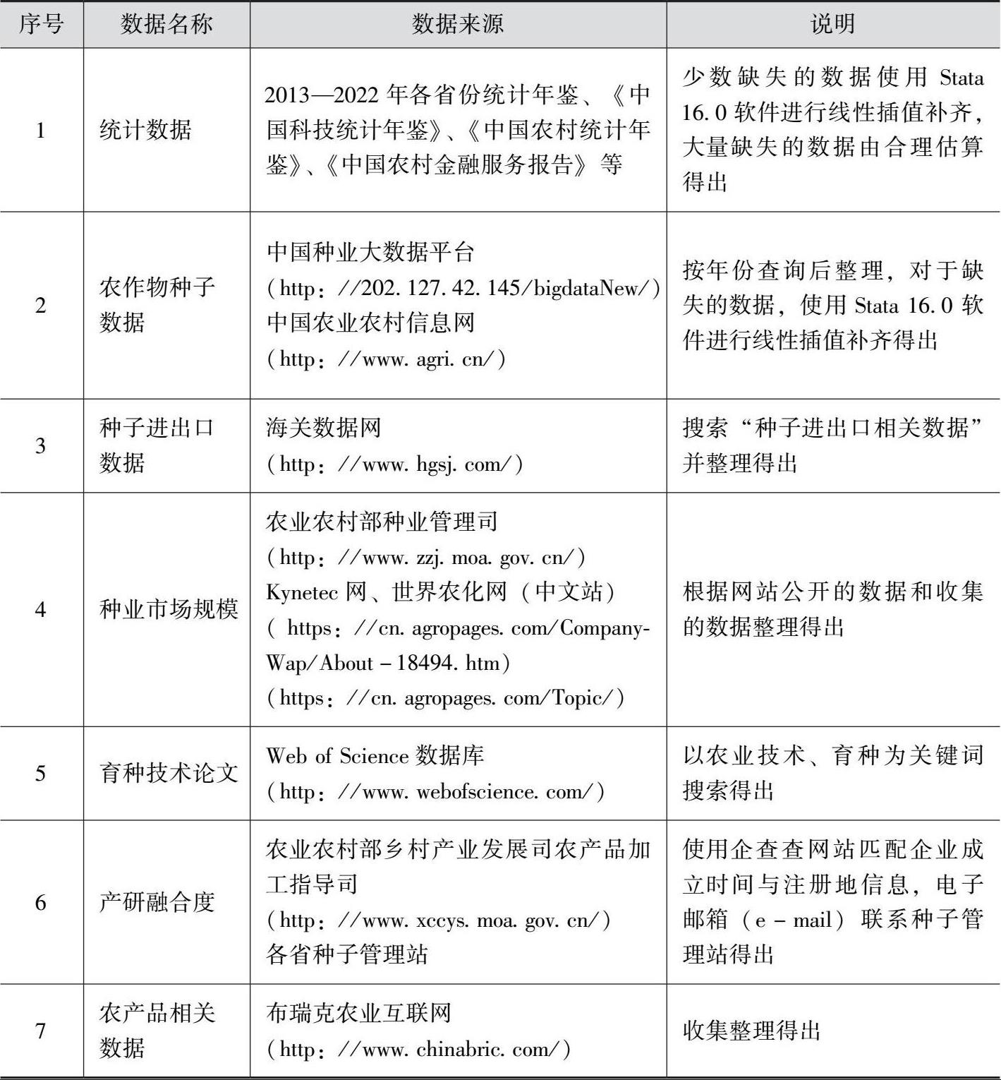 黄河流域9省(区)农作物种业高质量发展评价指标的数据来源均为历年各省份统计年鉴、《中国统计年鉴》、《中国科技统计年鉴》、《中国农村统计年鉴》、《中国农村金融服务报告》,部分农作物种子的数据根据中国种业大数据平台、农业农村部种业管理司、海关数据网在线查询平台、中国农业农村信息网以及Kynetec网、世界农化网(中文站)等整理得到,对于少数缺失的数据使用Stata 16.0软件进行线性插值补齐以满足面板数据的要求,具体数据来源及说明见表2-2。