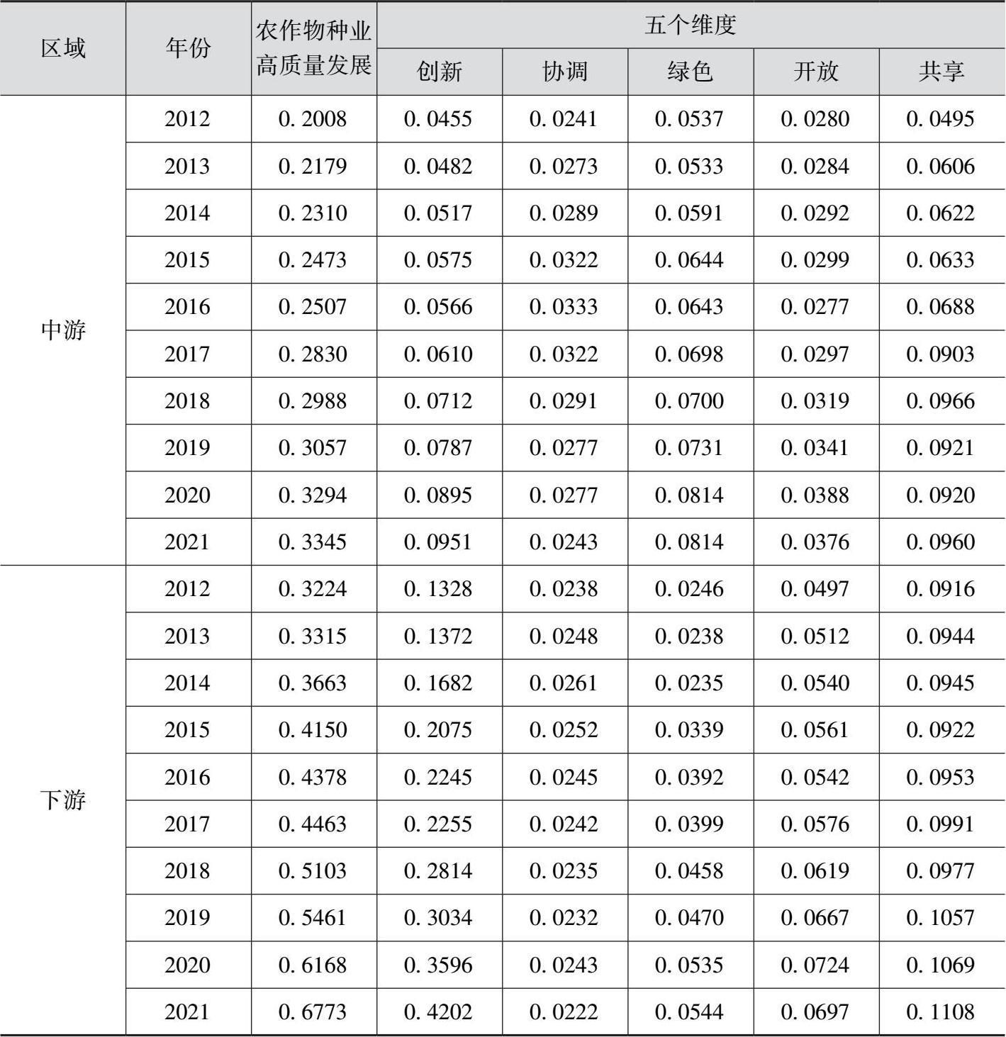 表2-5 2012—2021年黄河流域上、中、下游农作物种业高质量发展水平值