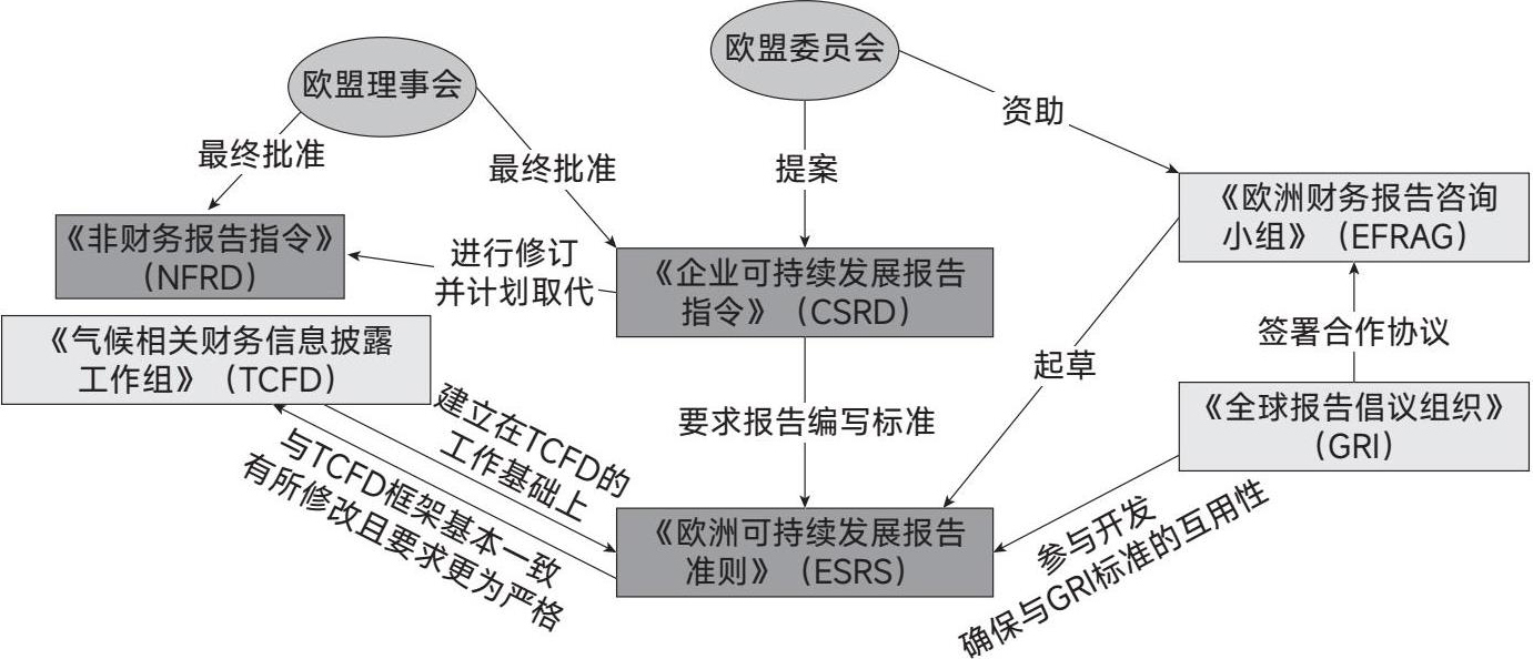 2022年3月,欧盟委员会通过了“减碳55一揽子气候计划”(Fit for 55),继续推动关键的实体经济改革,以实现其2030年气候和环境目标,具体政策内容包含碳定价、可再生能源和能源效率等;11月,欧盟理事会通过了《企业可持续发展报告指令》(CSRD),要求在欧盟监管范围内的大型公司、在欧盟上市公司或者在欧盟营业额超过1.5亿欧元,且在欧盟至少有一家子公司或分支机构的非欧盟公司按照《欧洲可持续发展报告准则》(ESRS)进行ESG披露(如图2-2所示)。
