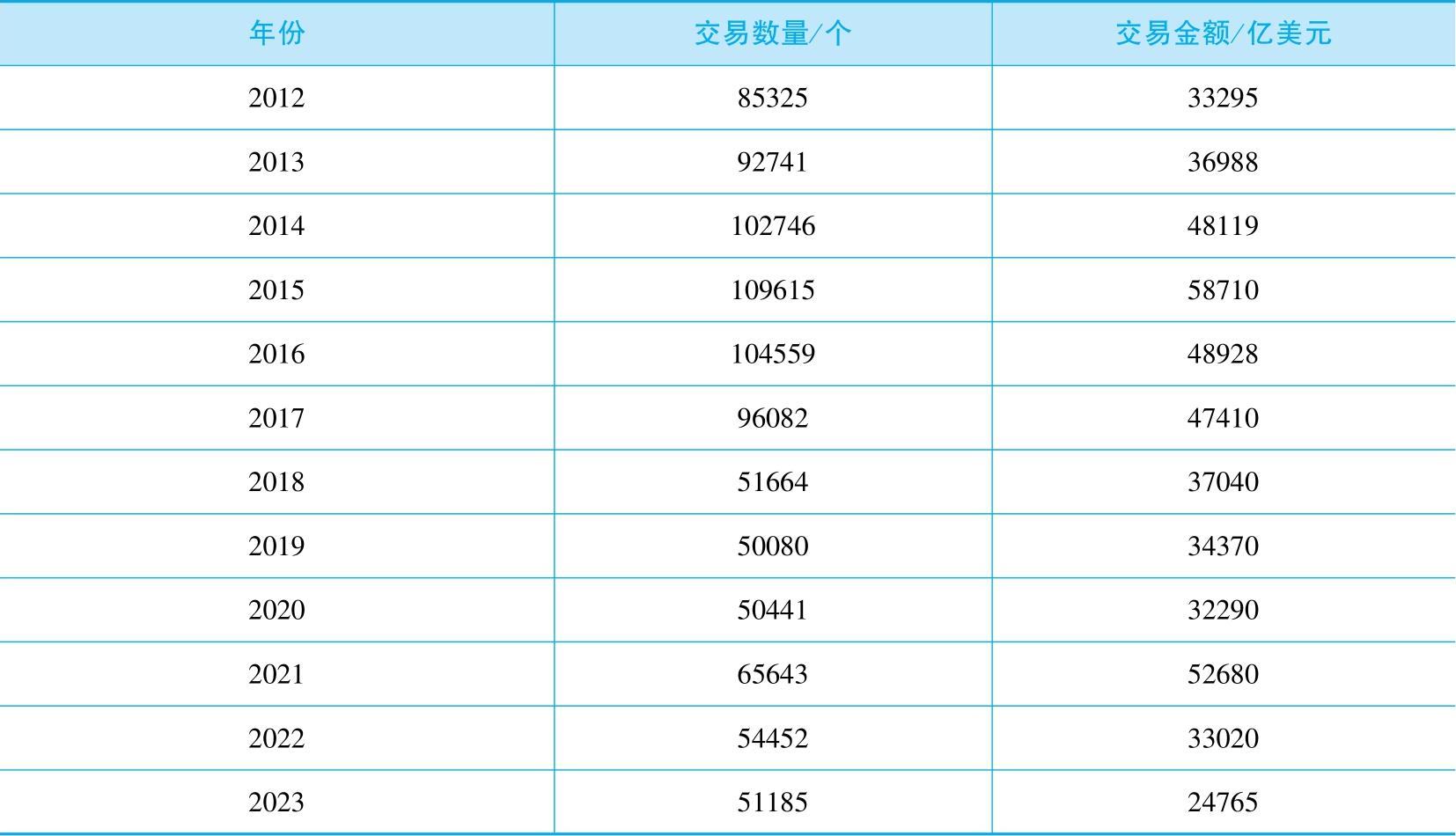 自新冠疫情以来,美国、欧洲等地长期实行激进的量化宽松政策,通胀高企推动央行加息,融资成本显著上升导致并购资金来源受限,宏观和微观的不确定性导致投资节奏整体放缓。全球核心市场并购交易估值下降,产业买家在并购交易中的参与度也不断提高(2020—2022年占比接近50%,2023年占比约70%)。当前全球央行整体暂停加息,未来利率预计在波动中呈下行走势。2023年及之前市场上存量交易发生的可能性和融资方案的可行性推动美国、欧洲等核心发达市场产生更多战略资产交易,值得关注。在传统跨境并购交易中,曾经不是核心判断要素或风险的问题浮出水面,包括通货膨胀、利率、资本供应、产业政策、国家安全、地缘政治紧张态势、供应链不确定性、监管态度的变化等,这对参与并购交易的各方都提出了新的要求。