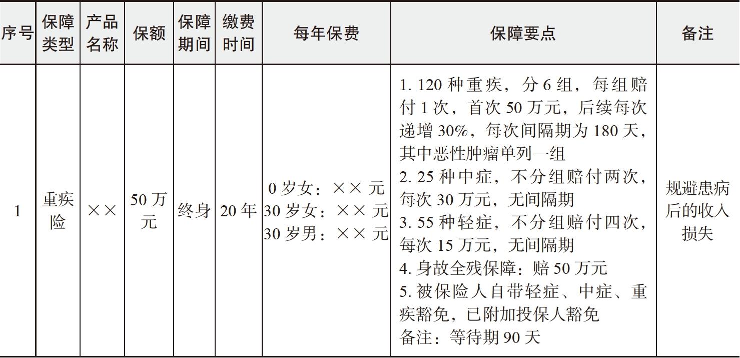 产品只是解决问题的工具,此处为你们列出了一家三口的组合方案,可供您及家人参考,您可根据需要选择其中一项或多项组合,保费与保额可以根据你们的实际情况进行调整。也可根据您当下实际情况,先做好基础保障,未来再陆续将全家保障补全,这样我就放心了。