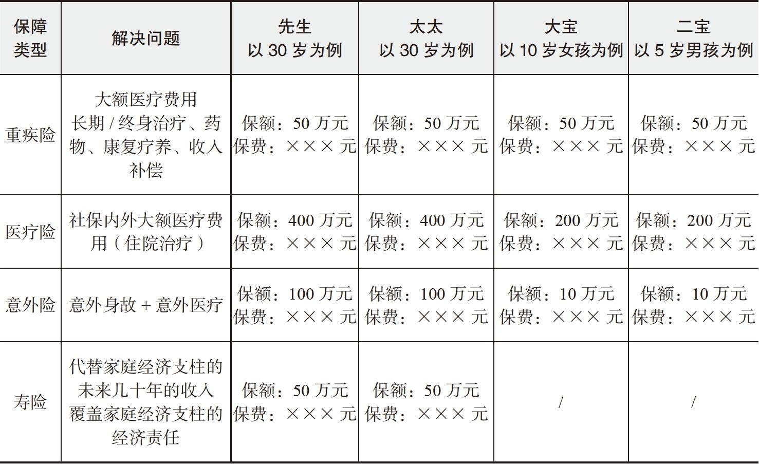 不需要保险的原因可能有很多,但需要买保险的理由上述两点就足够了。如下表格中为您列出了一般家庭的基础风险管理方案,保费与保额可根据您的实际情况调整。以上供您参考,如有不明白,可以随时讨论。