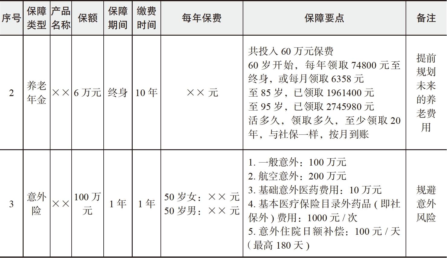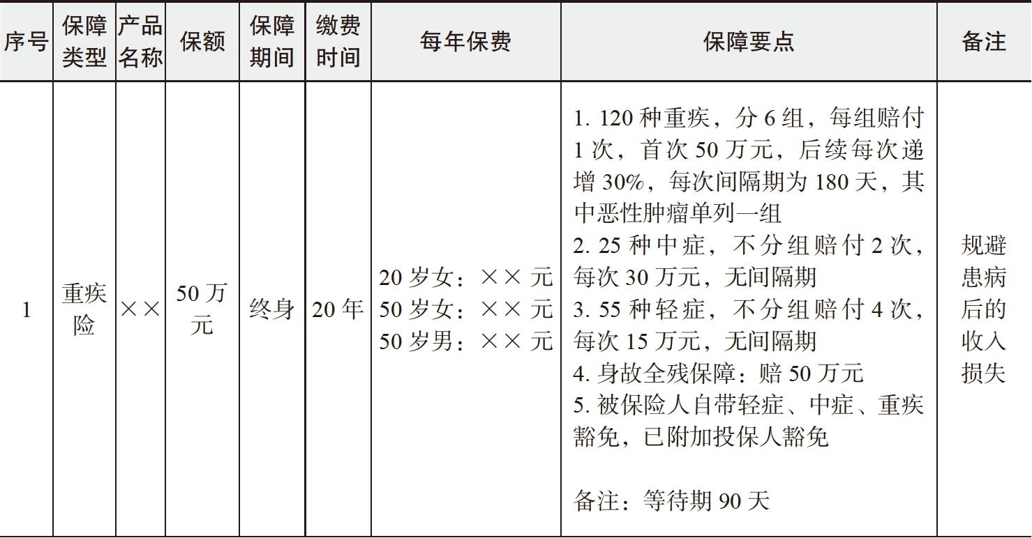 根据您之前在我这里规划的保险,我又做了一些补充,一家三口增加重疾险保障,你们夫妻二人增加一份养老金及意外险等,供您参考。具体增加项目的保额及保费可根据您的实际情况来定,以上您先参考。