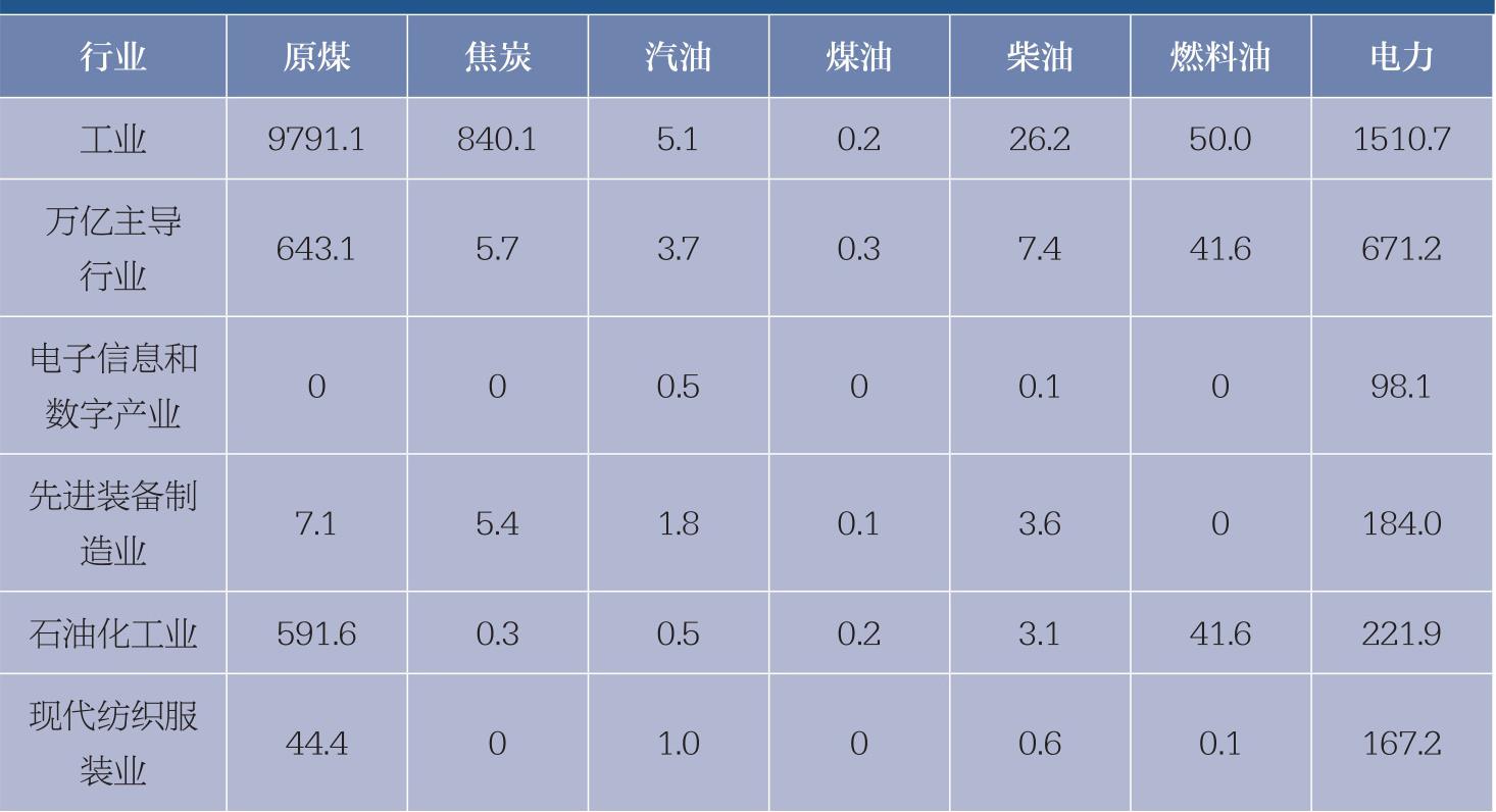 根据《福建统计年鉴(2022)》测算,2021年,福建省万亿主导产业规模以上工业综合能源消费量为2950.5万吨标准煤,同比增长21.9%,占工业消费总量的31.2%。从能源品种来看,万亿主导行业能耗以电力、原煤消费为主。其中,电力消费671.2万吨标准煤,占工业电力消费的36.4%;原煤消费643.1万吨标准煤,占工业原煤消费的9.2%,主要集中在石油化工行业;油品类消费53万吨标准煤,占工业油品类消费的45.4%,主要为燃料油;焦炭消费5.7万吨标准煤,占工业焦炭消费的0.7%。分行业来看,电子信息和数字产业、先进装备制造业、石油化工业、现代纺织服装业能源消费占万亿主导产业能源消费总量的比重分别为3.5%、7.8%、78.5%、10.2%,石油化工占据能耗的主导地位(见表2-3)。