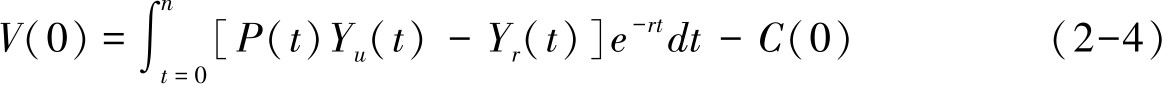 其中, γ 表示城市现代部门工作岗位创造率; N 表示现代部门总就业人数; S 表示城市地区总劳动力规模。为使模型更贴近实际,托达罗建立了长期人口流动行为模型: V (0)表示迁移者计划期内预期城乡收入差异的净贴现值; Y u ( t )和 Y r ( t )分别表示 t 期城市和乡村的实际工资率; n 表示时期数; r 表示贴现率。托达罗认为,该模型能反映迁移者的时间偏好程度。一个迁移者在现代部门找到工作以前的第 n 期的净收入贴现值公式为