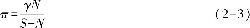 其中, w 表示城市实际工资率; π 表示就业概率; γ 表示农村人均实际收入。在任一时期,迁移者在城市能否找到工作取决于两个因素,即城市新增就业机会和城市失业人数。就业概率与城市新增就业机会成正比,与城市失业人数成反比,用公式表示为