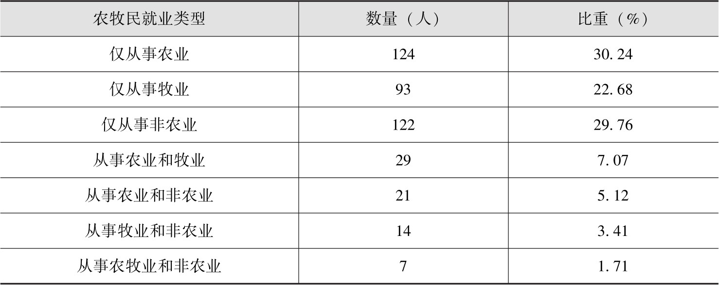 由表3-7可知,受访者中单纯从事农业、牧业和非农业的在抽样调查样本中的比重分别为30.24%、22.68%和29.76%;农牧业混合经营的受访者占到抽样调查样本的7.07%;从事农业和非农业、牧业和非农业、农牧业和非农业等兼业活动的受访农牧民分别占到抽样调查样本的5.12%、3.41%和1.71%,比重大大低于单纯从事农业、牧业和非农业的农牧民。这表明,青海省农牧民的就业活动比较单一,混合就业或兼业在该地区并非主要的就业形式。