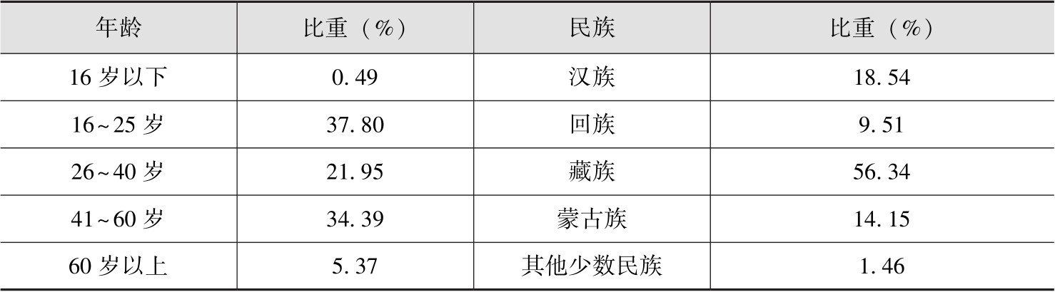 在抽样调查样本中,受访者年龄主要集中在16~60岁,占到抽样调查样本的94.14%。具体来看,16~25岁、26~40岁和41~60岁的受访者占比分别为37.80%、21.95%和34.39%,而16岁以下和60岁以上的受访者分别仅占抽样调查样本的0.49%和5.37%。抽样调查样本中的受访者年龄结构之所以会出现青壮年劳动力占比较高的情况,是因为此次调研在进行抽样调查时,尽可能针对受访者所在家庭户主进行调查,这样更能反映农牧民及其家庭的非农就业状况。青海省各市州农牧民非农就业调查问卷中受访者年龄与民族状况见表3-5。