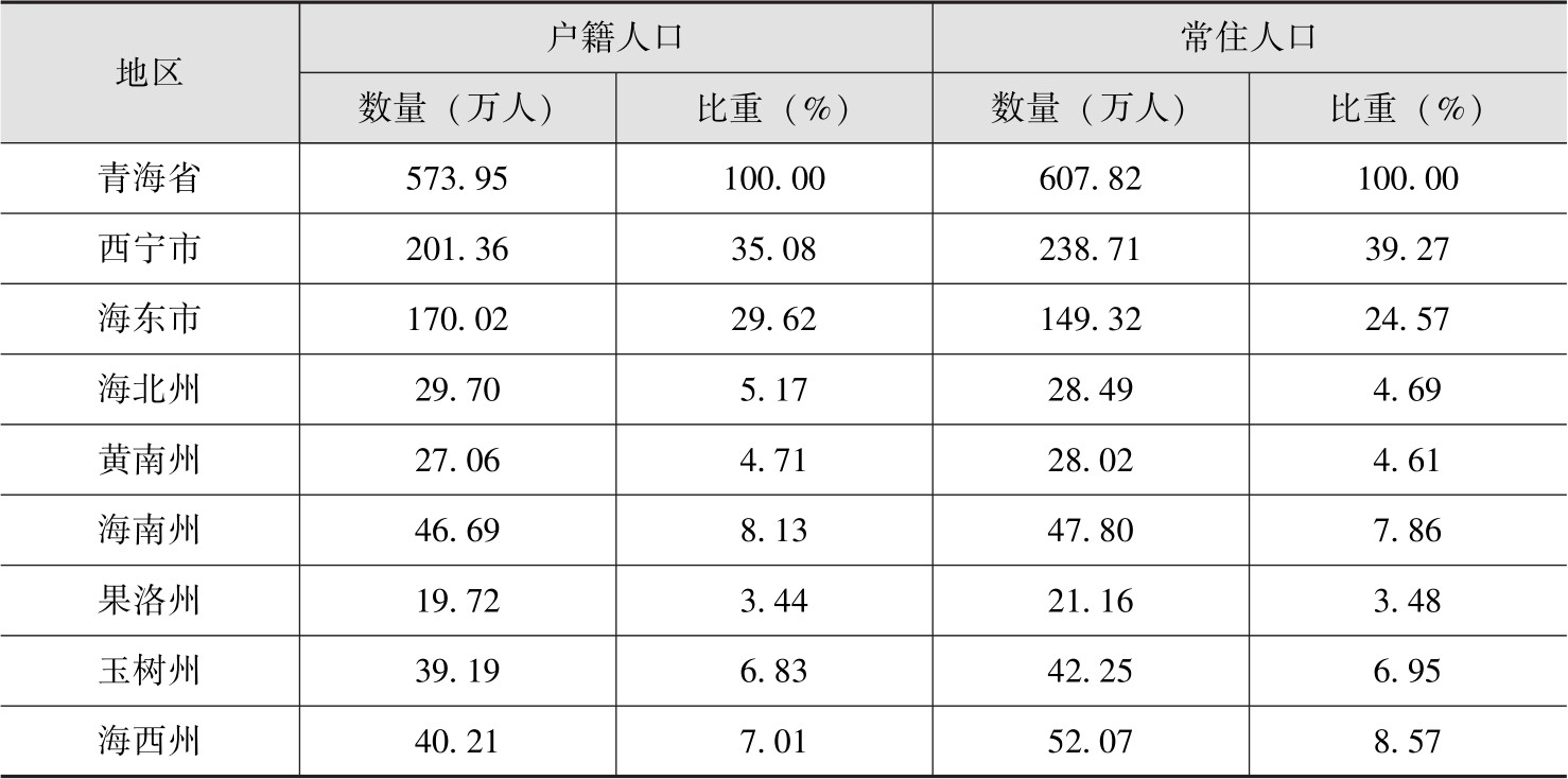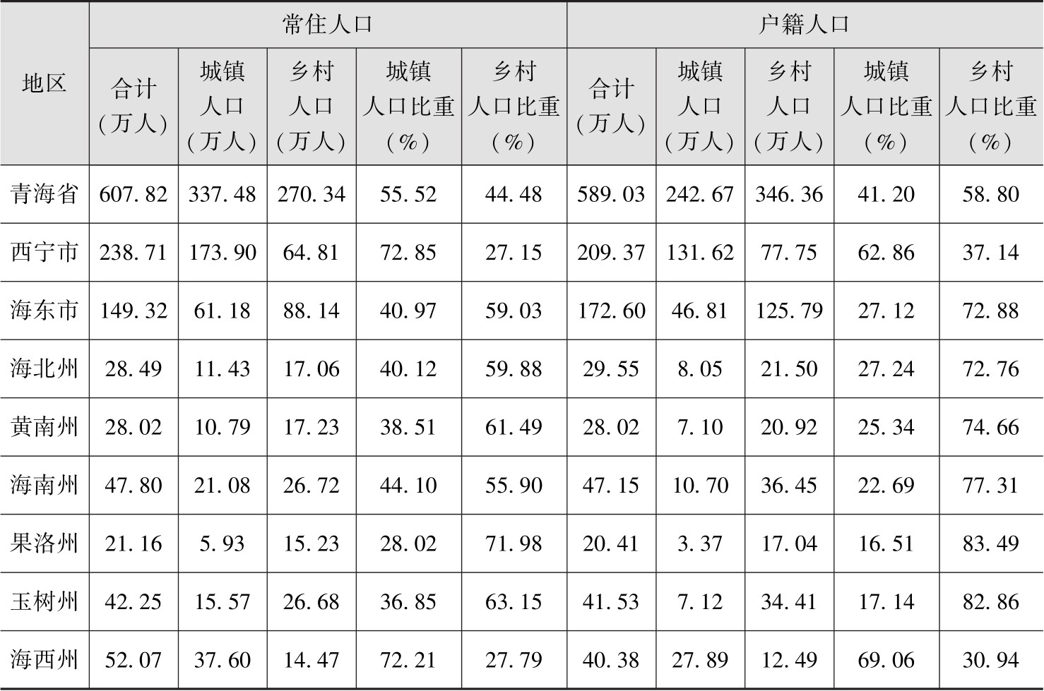 据统计,2020年,在青海省常住人口中,城镇人口为337.48万人,占青海省人口的55.52%,乡村人口为270.34万人,占青海省人口的44.48%,城镇人口比重高于乡村人口比重。按户籍人口计算,2020年青海省城镇人口为242.67万人,占青海省户籍人口的41.20%,乡村人口为346.36万人,占青海省户籍人口的58.80%,乡村户籍人口比重显著高于城镇户籍人口比重。乡村户籍人口比重(58.80%)高于乡村常住人口比重(44.48%),表明青海省人口在城乡间流动频繁,体现出明显的乡村人口向城镇流动的人口迁移特征。从各市州的情况来看,无论是按常住人口计算还是按户籍人口计算,作为省会的西宁市和工业发达的海西州城镇人口比重都较高,乡村人口比重都较低;城镇人口比重越低的市州,从乡村向城镇流动的人口迁徙特征越显著,如海东市常住人口和户籍人口城镇化率分别为40.97%、27.12%,相差13.85个百分点。2020年青海省各市州城乡人口分布状况见表3-2。