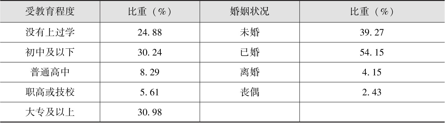 在抽样调查样本中,大专及以上学历的受访者所占比重为30.98%,初中及以下学历和没有上过学的受访者所占比重分别为30.24%和24.88%,普通高中和职高或技校学历的受访者占比之和为13.90%,该抽样样本照顾到了不同教育程度的受访者,能够全面反映青海省农牧民的非农就业状况。除此之外,在婚姻状况方面,已婚受访者占到54.15%,未婚受访者占到39.27%,离婚和丧偶的受访者所占比重分别为4.15%和2.43%。青海省各市州农牧民非农就业调查问卷中受教育程度和婚姻状况见表3-6。