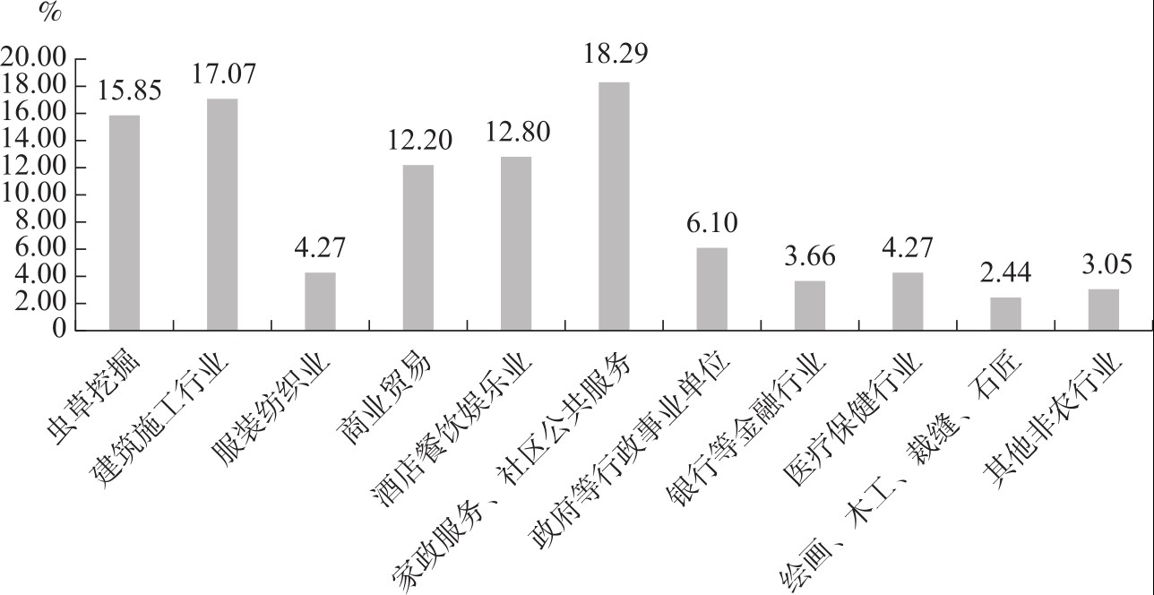 为了更清晰地分析青海省非农就业的具体情况,我们将非农行业细分为建筑施工行业、虫草挖掘、商业贸易等具体的行业(工种)。相关文献及参考资料中对行业的表述不完全一致,本书不作严格区分。抽样调查结果(如图3-3所示)显示,15.85%的农牧民会依托当地虫草资源,进行虫草的挖掘和销售。在建筑施工行业就业的农牧民占到抽样调查样本中非农就业人数的17.07%。更多的农牧民选择从事对知识和技能要求不太高的服务行业(如商业贸易,酒店餐饮娱乐业,家政服务、社区公共服务,服装纺织业),这些非农行业的从业者占到抽样调查样本中非农就业人数的47.56%。农牧民中在政府等行政事业单位、银行等金融行业以及医疗保健行业等对知识和技能要求较高的行业工作的比重较低,仅占到抽样调查样本中非农就业人数的14.03%;从事绘画、木工、裁缝、石匠等传统工作的农牧民较少,仅占到抽样调查样本中非农就业人数的2.44%。在非农就业行业选择上,青海省农牧民主要倾向于低技能和知识密度较低的非农产业,对知识、技能要求较高的行业所占比重较低,传统手工行业所占比重也较低。