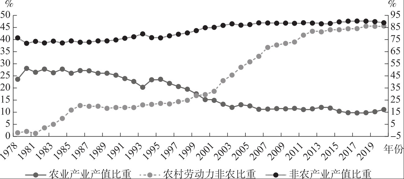 图3-2 改革开放以来青海省产业结构与农村劳动力非农就业演化趋势