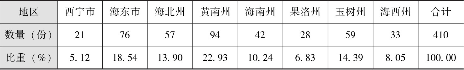 在410份问卷中,西宁市和海东市占比之和为23.66%,海东市占比为18.54%,西宁市占比为5.12%;其余6个自治州占比之和为76.34%,其中,黄南州、玉树州、海北州和海南州占比分别为22.93%、14.39%、13.90%和10.24%,海西州和果洛州占比分别为8.05%和6.83%。