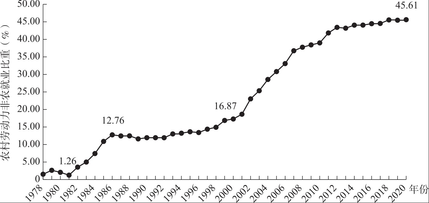改革开放以来,青海省农村劳动力非农就业比重在保持总体上升趋势的同时,也呈现出典型的阶段性特征,具体可分为五个阶段:农村劳动力非农就业徘徊期(1978—1981年),农村劳动力非农就业第一个快速增长期(1982—1986年),农村劳动力非农就业第一个稳定增长期(1987—1999年),农村劳动力非农就业第二个快速增长期(2000—2010年),农村劳动力非农就业第二个稳定增长期(2011—2020年)。
