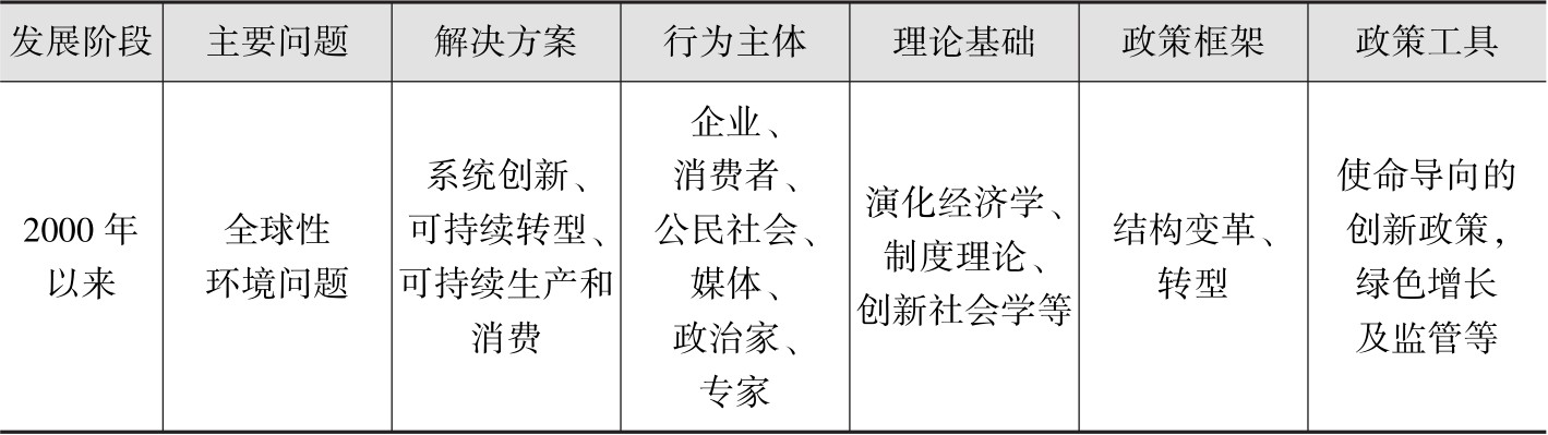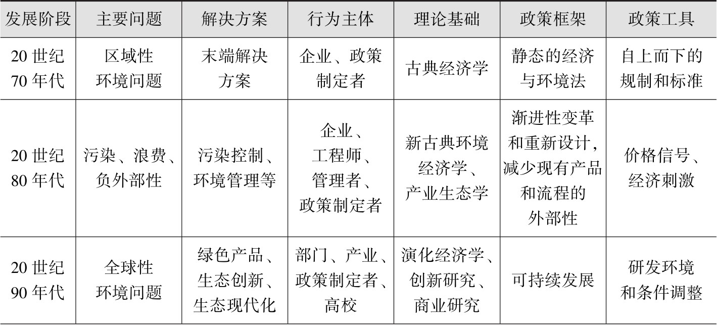 20世纪70年代以来,学术界关于环境和可持续发展问题的讨论持续存在,并且形成了两种研究框架:一是基于问题和解决方案的问题框架,二是基于理论方法的解析框架。随着人们对环境和可持续发展问题的日益关注和重视,这两种研究框架也得到进一步拓展(Smith et al.,2010)。问题框架始于20世纪七八十年代对区域性资源环境问题的考虑,相应形成了以古典经济学和新古典经济学理论为指导的末端技术解决方案,即基于清洁技术的环境治理。古典经济学和新古典经济学等主流经济学理论认为,环境治理与经济发展是分立的,主张运用价格信号、经济刺激等静态方法进行环境治理,并发展形成了新古典主义环境经济学。上述主流经济学理论一般假设企业和个人是理性决策的,对非经济的因素关注较少,将价格作为关键变量,在政策制定方面也主要考虑消除经济方面的障碍,如信息不对称、交易成本等问题。不仅如此,主流经济学对于创新过程、政策支持的有效方式等问题,也较少涉及。因此,主流经济学理论在一定程度上限制了激进式创新的形成、扩散和突破以及人们对社会-技术系统转型的理解。