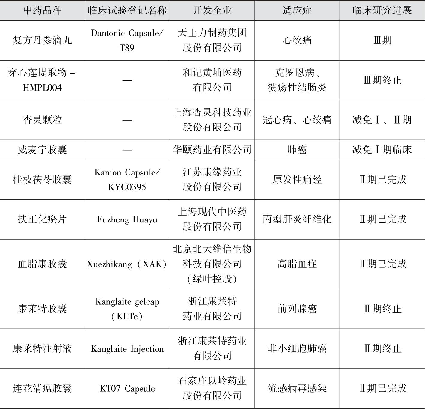 据不完全统计,我国已有10余种中药产品向美国FDA提交了IND,如表2-2所示。但截至目前,暂无中药品种获得FDA药品上市许可。