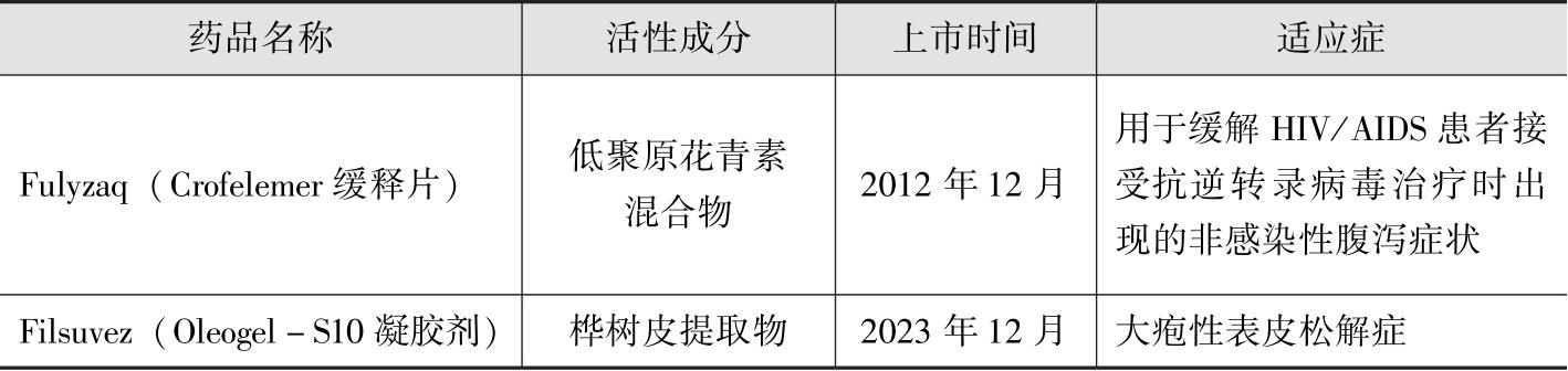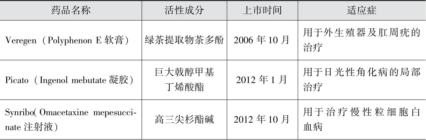 迄今为止,美国FDA共批准了5种植物药,其中,3种为外用制剂,另外2种分别为口服制剂和注射剂,详见表2-1。
