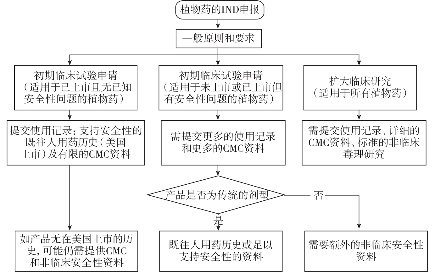 美国FDA认识到植物药具有成分复杂、活性成分不明确的特点,而且传统植物药具有广泛的人用经验,因此,对其初期临床研究(相当于Ⅰ/Ⅱ期临床)和扩大临床研究(相当于Ⅲ期临床)的申报要求,会根据药物的具体情况做出相应的调整,详见图2-2。