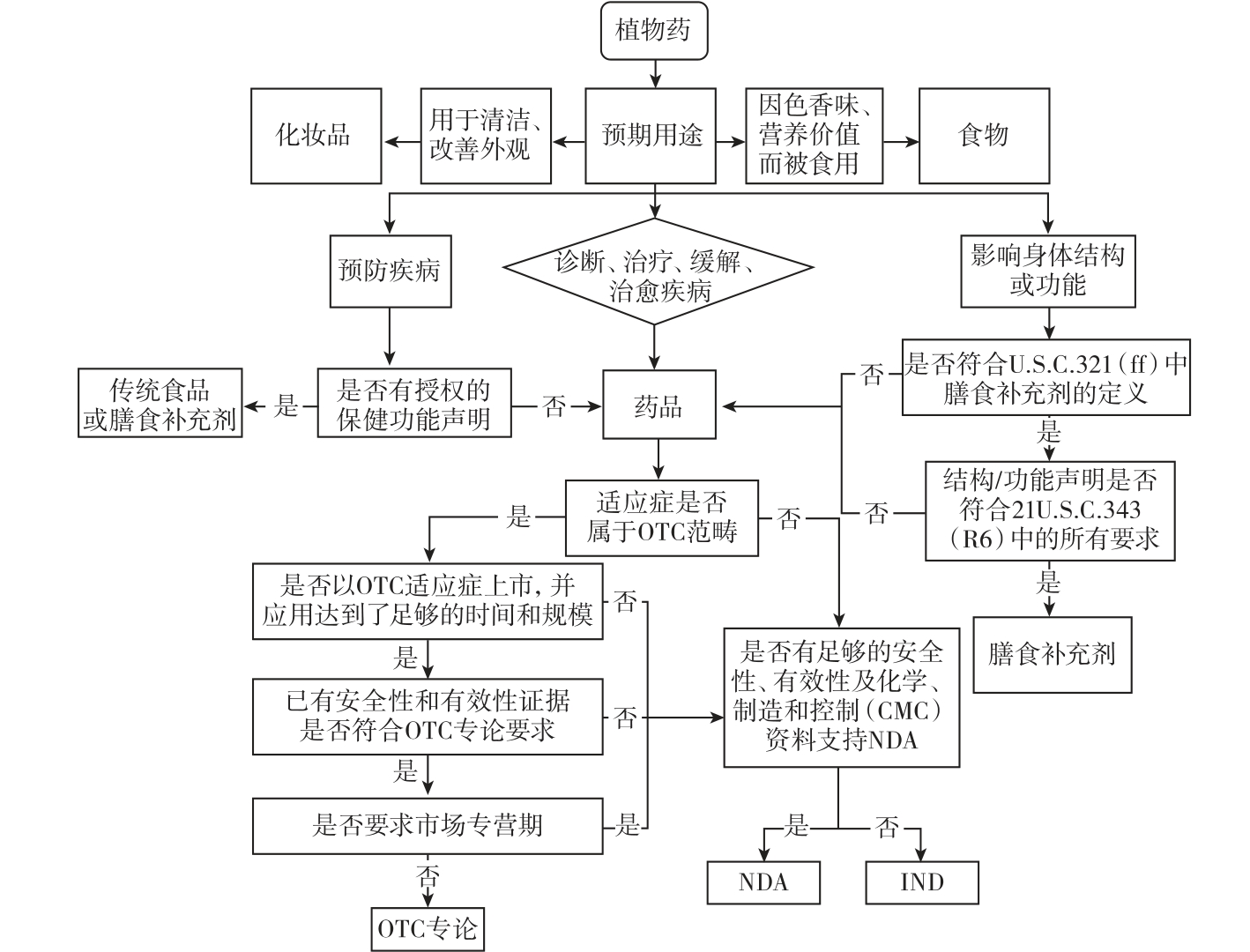 美国上市的植物产品形式主要有食品、膳食补充剂、药品[非处方药(OTC)、处方药]、化妆品或医疗器械。美国食品药品监督管理局(FDA)主要是根据产品用途确定其分类,非植物药类产品需要声明“该产品不能用于疾病的诊断、治疗、治愈或预防”。