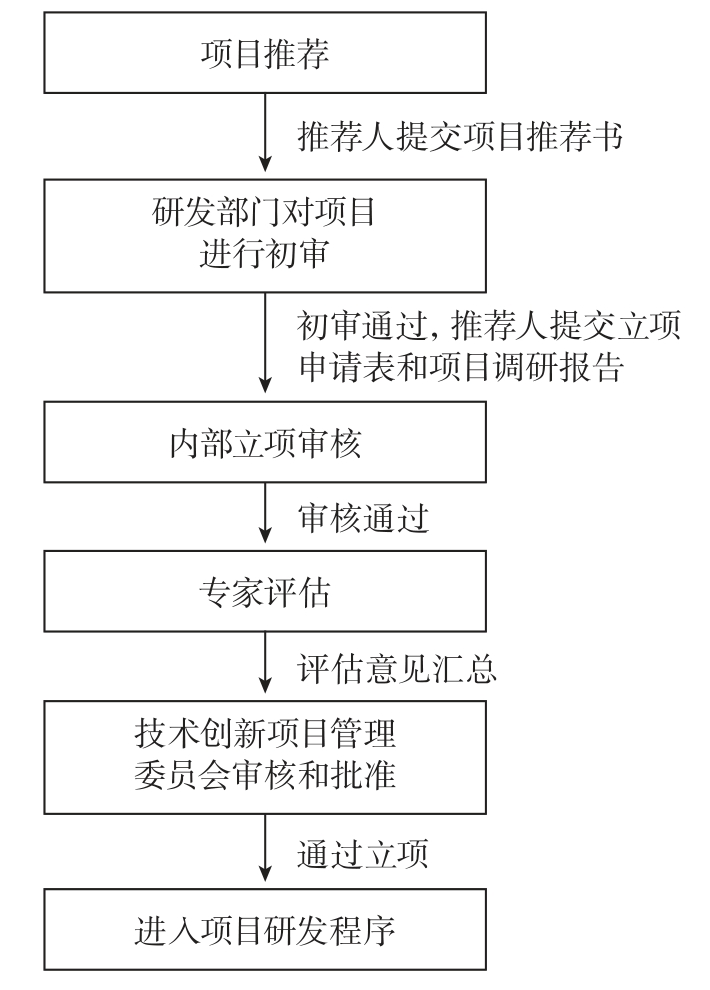 (3)研发部门对推荐项目进行初审,初审通过后项目推荐人应提交项目立项申请表(模板见附录4)和项目调研报告(模板见附录5),企业研发、市场、营销、财务等相关部门进行内部立项审核。