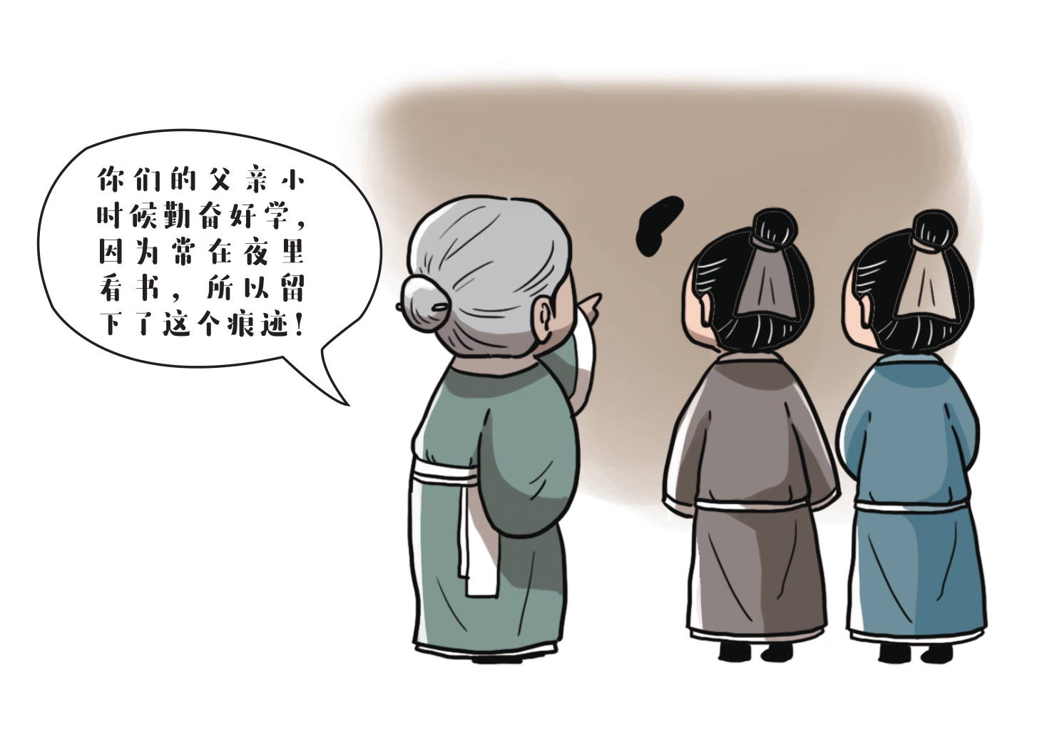 范仲淹每天夜里都在帐中读书,帐顶都被灯熏黑了。等他做了官之后,他的夫人就把熏黑的地方指给儿子们看,说:“你们的父亲小时候勤奋好学,因为常在夜里看书,所以留下了这个痕迹!”