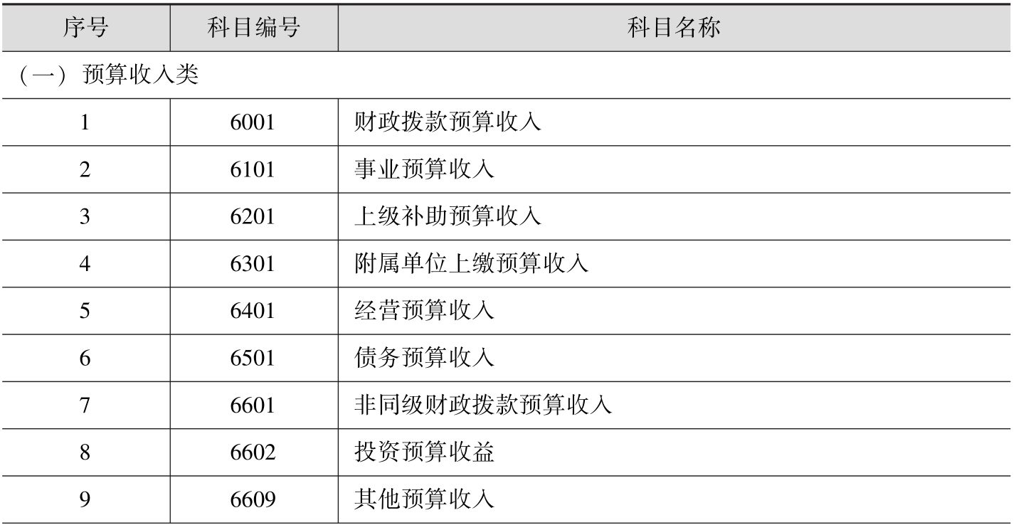 政府预算会计的会计科目是预算会计中会计要素的具体化。预算会计有三要素,分别是预算收入、预算支出和预算结余。按照《政府会计制度——行政事业单位会计科目和报表》的规定,预算会计的会计科目和编号见表2-1。