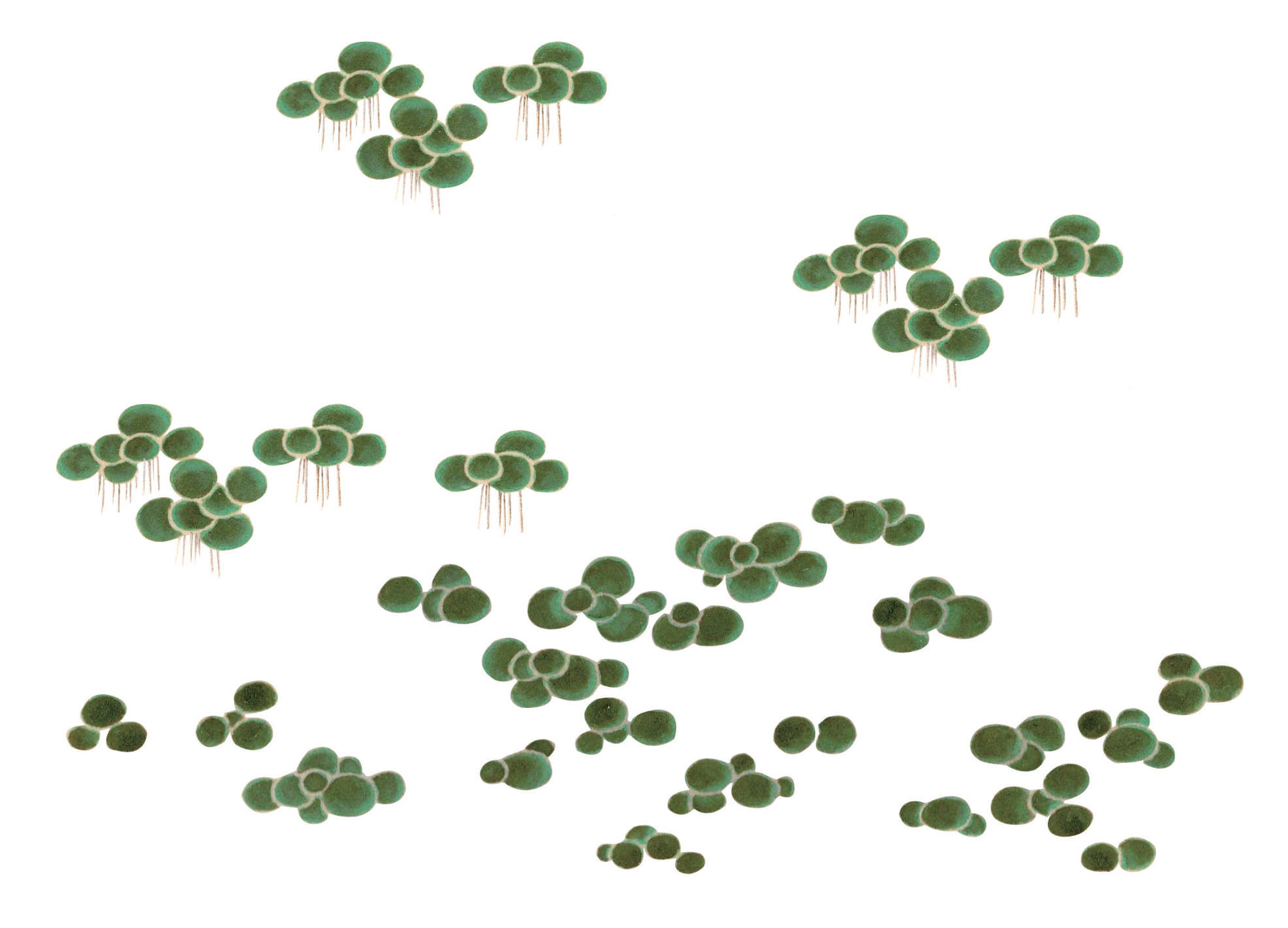 浮萍依靠垂在水中的须根获取养料,不过它们的须根都很短小,没有固着能力,所以浮萍只能在水面浮生,随流漂泊,聚散不定。古人观察到浮萍的漂动,觉得人与人的聚散正如浮萍那般聚散偶然,离合难测,便有了“萍水相逢”的说法。