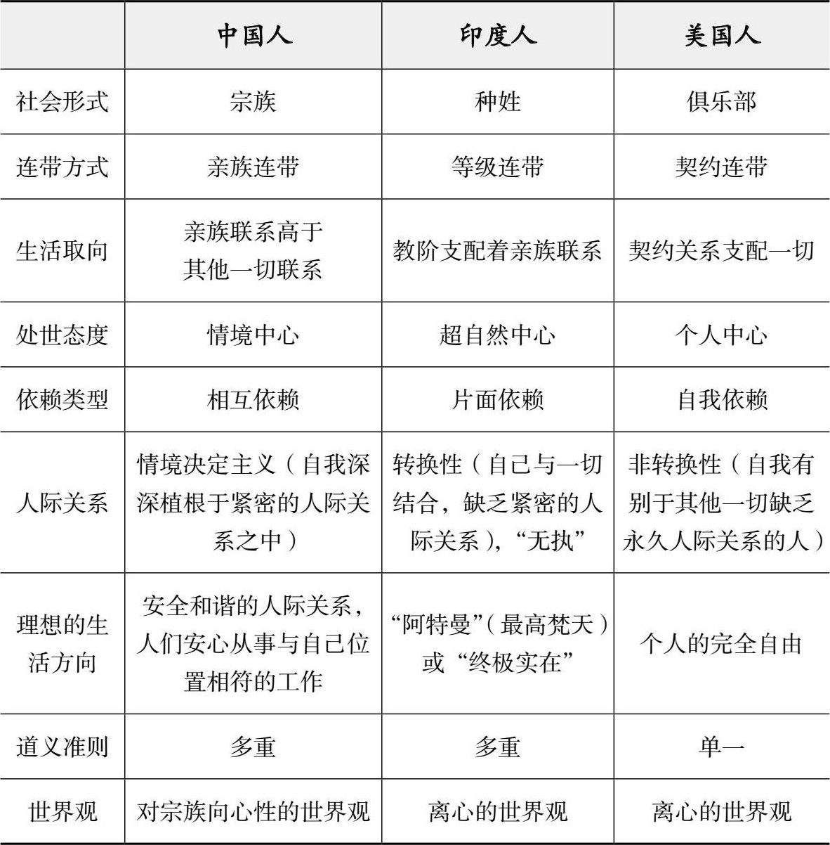 资料来源:许烺光.宗族·种姓·俱乐部[M].北京:华夏出版社,1990(经过笔者整理)。