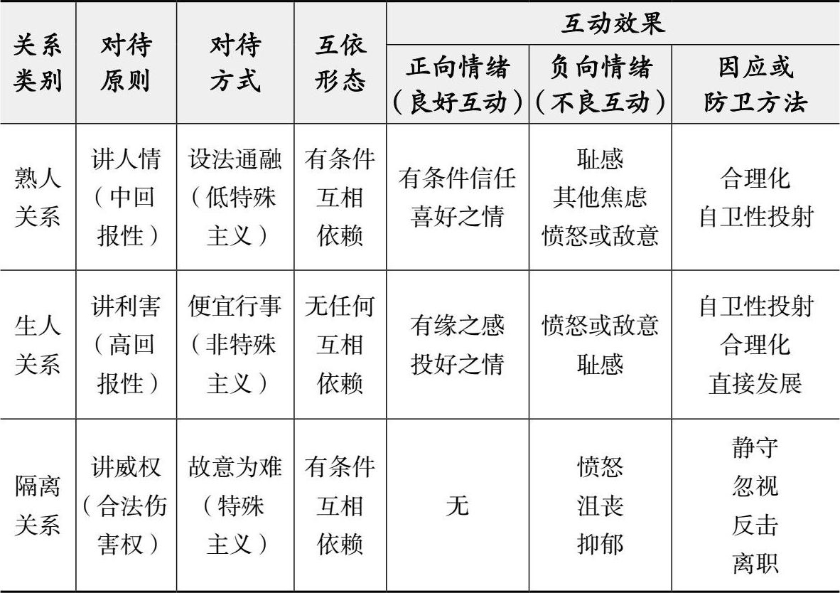 从差序格局的特殊主义(费孝通,2004)来分析,人们的关系也是因人而异,是一种“特殊连带”(Jacobs,1979;Tsui and Farh,1997)。关系对于日常的人际互动至关重要(Chen et al.,2013;Tsuiand Farh,1997;Xin and Pearce,1996)。所以,人际互动第一步通常把关系判断作为双方交往的基础,资源支配者首先考虑对方与自己是什么性质的关系以及关系的强度,其次采用不同的交往法则与关系性质和强度不同的人互动(Hwang,1987)。杨国枢(2005)将人际互动分为三种类型:家人关系、熟人关系与生人关系。家人关系的对待原则是高特殊主义的不计回报、讲责任;熟人关系的对待原则是计回报讲人情、低特殊主义的利益交换关系;生人关系的对待原则是非特殊主义、讲利害。本书认为,除以上三种人际关系,还有一种隔离关系,四种社会关系中的不同人际对待原则、对待方式、互依形态及互动效果如表2-3所示。