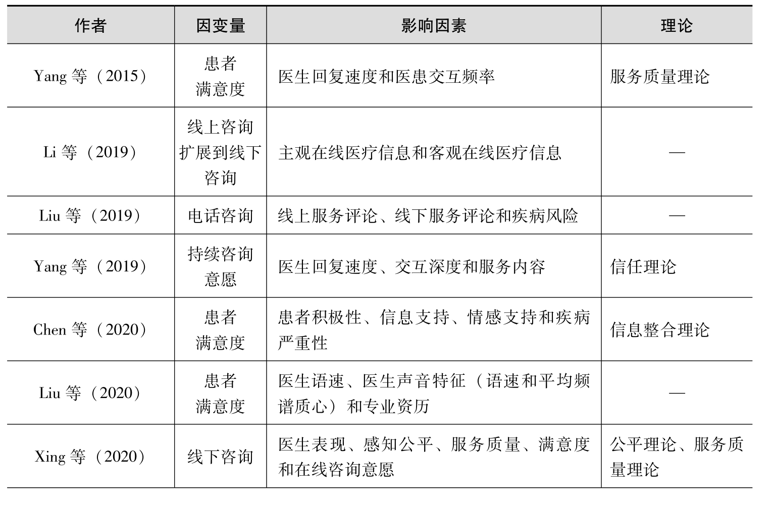 在购买(咨询)决策阶段,患者根据有咨询意愿的医生提供的咨询方式,选择某一种向医生咨询。购买(咨询)决策阶段的患者行为研究,包括患者咨询方式的选择(Li et al., 2019;Liu et al., 2019;Xing et al., 2020)、患者满意度(Chen et al., 2020;Liu et al., 2020;Yang et al., 2015)和患者持续咨询意愿(Li et al., 2021;Yang et al., 2019)等,见表2-3。不同于传统的、单一的和面对面的咨询方式,在线医疗社区提供了以专家为核心的线上医疗服务,主要运营模式分为咨询服务和“预约转诊”服务两类,其中,咨询服务的主要形式有图文咨询、电话咨询、私人医生服务和专家团队服务(Wu and Lu, 2017),医生和患者通过问答的方式进行交流;在线医疗社区还免费提供“预约转诊”特色服务(Li et al., 2019),允许患者直接向医生提交病情,预约门诊加号,到医生工作的医院和科室就诊,与医生面对面交流(马骋宇,2016)。与购买决策阶段的消费者行为研究相似,购买(咨询)决策阶段的患者需要决定以何种方式向有咨询意愿的医生咨询,也就是咨询方式(渠道)的选择,如图文咨询、电话咨询、线下咨询,或者使用“预约转诊”服务从线上咨询扩展到线下咨询。例如,Li等(2021)关注了患者通过在线医疗社区的“预约转诊”功能从线上咨询拓展到线下咨询的行为,将在线健康信息分为主观信息和客观信息。结果表明,高质量的主观健康信息和客观健康信息会促使患者从线上医疗服务扩展到线下医疗服务,并且主观信息对患者决策的影响排挤了客观信息的影响。此外,购买(咨询)决策阶段涉及医生与患者之间的在线交互,患者向有咨询意愿的医生描述自身疾病,医生根据患者的情况提供可行的治疗建议。因此,在在线医患交互过程中,医生的表现会影响患者满意度,也会影响患者持续咨询意愿。例如,Yang等(2015)基于服务质量理论从交互质量和交互频率两个维度衡量医生的交互质量,结果表明,医生的回复速度和医患交互频率会影响患者的满意度。