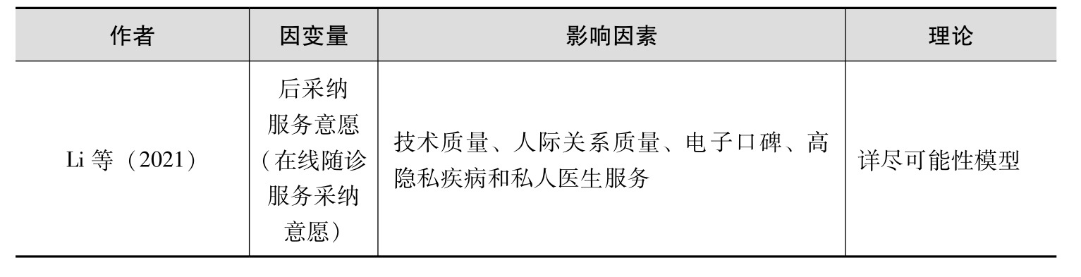 此外,在线医疗社区还为患者提供了一种在线随诊服务,使得已经在线下医院接受过医生医疗服务的患者能够在在线医疗社区中找到同一个医生,上传检查报告和诊疗记录等,以便获得后续的、进一步的诊断治疗,而不需要再到医院就诊(Li et al., 2021)。这也是对医生服务后采纳的体现,是患者对一个医生医疗服务的持续采纳。但是,相较于对在线医疗服务初始采纳的研究,目前对在线医疗服务后采纳的研究还很匮乏。例如,Li等(2021)关注了在线医疗社区的在线随诊服务,研究表明,医生医疗服务的技术质量、人际关系质量和电子口碑对患者在线随诊服务的采纳意愿有积极影响,高隐私疾病和私人医生服务显著调节医生医疗服务的技术质量或电子口碑与患者在线随访服务采纳意愿的关系。