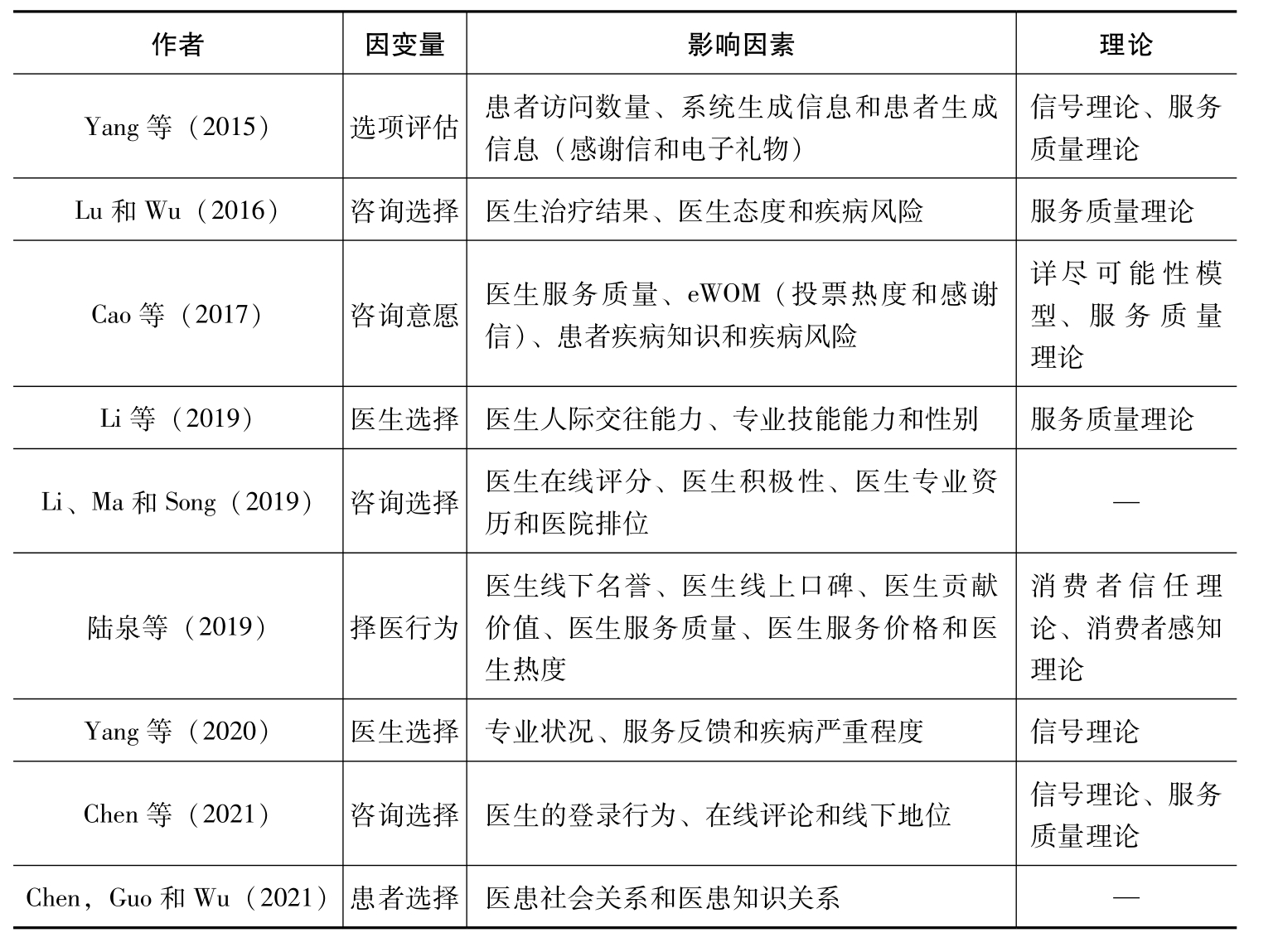 在线医疗社区为患者提供了一个向医生咨询的渠道,患者通过评估筛选在线医疗社区的医生选项,最终选择一个合适的医生咨询。选项评估阶段患者行为及其影响因素的相关研究见表2-2。患者的主要行为包括咨询意愿和咨询选择(Cao et al., 2017;Lu and Wu, 2016;Yang et al., 2015)。通过访问在线医疗社区,患者可以获取搜索疾病类型下的所有医生列表,以及各个医生选项的初始信息(如姓名、医学职称、工作地点、推荐热度、擅长领域等)。患者通过浏览初始信息对医生进行初步评判并决定是否访问医生的个人网站。如果患者对某医生有咨询意愿,就会访问该医生个人网站以获取更多信息。反之,如果患者对某医生没有进一步了解的意愿,就不会进入该医生的个人网站(Chen et al., 2020;Yang et al., 2015)。患者在进入有咨询意愿的医生个人网站后,能获得除初始信息以外更加全面的信息,如医生在线行为信息、患者评价信息、访客数量和患者数量等。最后,患者根据获得的所有信息对医生做出评估,产生咨询意愿。