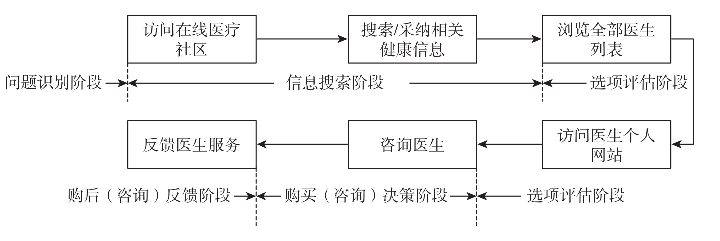 在在线医疗社区中,患者的决策过程也是一个动态的、持续的决策过程,与消费者决策过程相似。但是,因为患者在进入在线医疗社区前已经明确了自己的健康问题和需求,完成了需求识别,也就是经历了需求识别阶段。所以,在线医疗社区患者在线决策过程可以概括为信息搜索、选项评估、购买(咨询)决策和购后(咨询)反馈4个阶段,如图2-2所示。具体而言,首先,患者基于自己的健康问题和需求访问在线医疗社区,搜索相关健康信息并采纳。如果健康信息未解决患者疑惑,患者就在在线医疗社区中选择合适的医生,以合适的方法进行咨询。其次,患者在咨询后对医生的医疗服务进行反馈,例如,打分、撰写文本评论等。