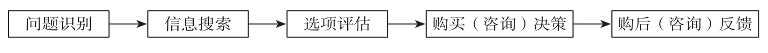 随着阶段的不同,消费者决策行为也表现出不同的特征。Kotler和Franke(1990)将消费者决策按照先后顺序分为问题识别、信息搜索、选项评估、购买(咨询)决策和购后(咨询)反馈5个阶段,如图2-1所示。随着网络技术的普及,电子商务得到了蓬勃发展,在线交易成为一种快捷便利的交易方式,从根本上改变了人们的消费方式。消费者决策过程已经被广泛应用于电子商务环境。在线决策过程是一个动态的、持续的决策过程,许多因素使这一复杂过程变得更加复杂化(Wen and Fang, 2014)。