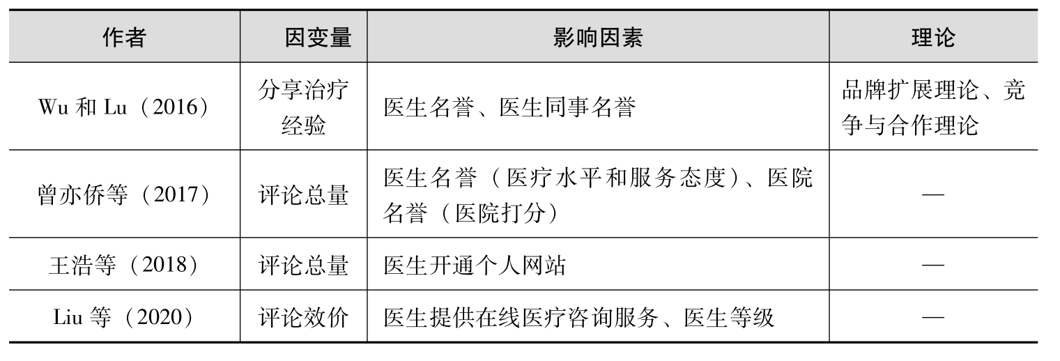 与其他网站相同,在线医疗社区也为患者提供了反馈系统。经历过医生服务的患者对于医生的服务质量有了一个充分的了解,在平台上进行反馈。购后(咨询)反馈阶段患者行为及其影响因素研究如表2-4所示,包括患者分享治疗经验(Wu and Lu, 2016)和评论行为(Liu et al., 2020;曾奕侨等,2017;王浩等,2018)等。在在线医疗社区中,患者的反馈内容为个人的就诊和治疗经历与主观评价,即共享个人体验和知识。一方面,这些反馈信息为其他患者提供了判断医生服务质量的依据,帮助患者减少与医生之间的信息不对称,降低感知风险。例如,Yang等(2015)研究发现,除了在线医疗社区的系统生成信息,患者反馈的信息——患者生成信息,也是患者选择医生就诊的重要依据,对患者的选项评估和购买(咨询)决策有正向影响。Chen等(2021)研究表明,在在线医疗社区中,医生得到的患者评论数量是判断其服务结果质量的依据,对患者选择合适的医生咨询有积极影响。另一方面,患者的反馈信息帮助医生建立自己的在线名誉,并且获得相应的社会回报和经济回报(Guo et al., 2017)。然而,过去关于在线医疗社区患者评论大多数是对其作用的研究(Chen et al., 2021;Han et al., 2019;Li et al., 2019;Yang et al., 2015),对患者如何撰写评论的研究相对较少。