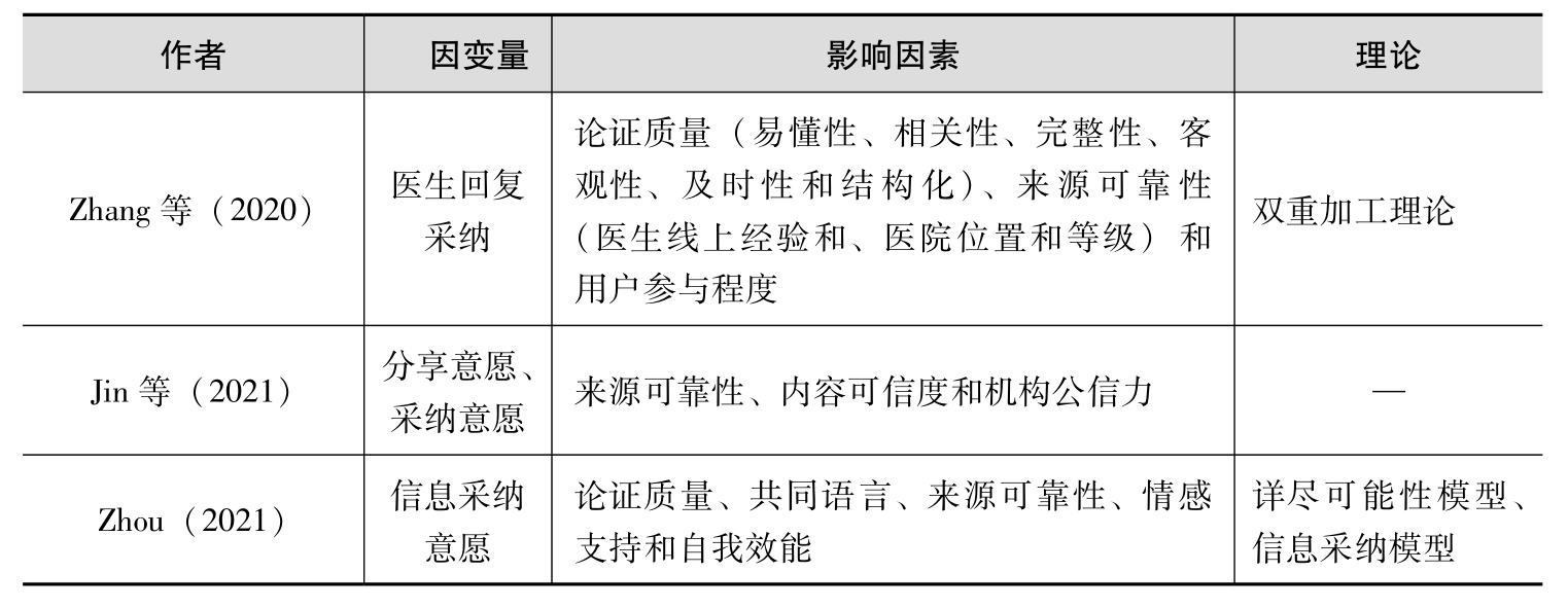 然而,在线医疗社区也为患者提供了一个在线搜索健康信息的渠道,并且患者在在线医疗社区中采纳的健康信息是独特的。与普通的健康信息提供者不同,在线医疗社区的健康信息提供者是医生,他们拥有专门的医疗技能和专业知识(Zhang et al., 2020)。首先,患者通过在在线医疗社区中就自己的健康需求发布问题,希望得到医生的专业解答。其次,在线医疗社区的医生在看到患者的健康问题后,利用自己的专长为患者提供答案。最后,患者从得到的医生答案中选择最佳的答案并采纳。例如,Zhang等(2020)关注了在线医疗社区的健康信息采纳,研究表明,在医生提供的健康信息中,论证质量和来源可靠性是患者采纳健康信息的重要策略,用户参与度能够调节它们之间的关系。