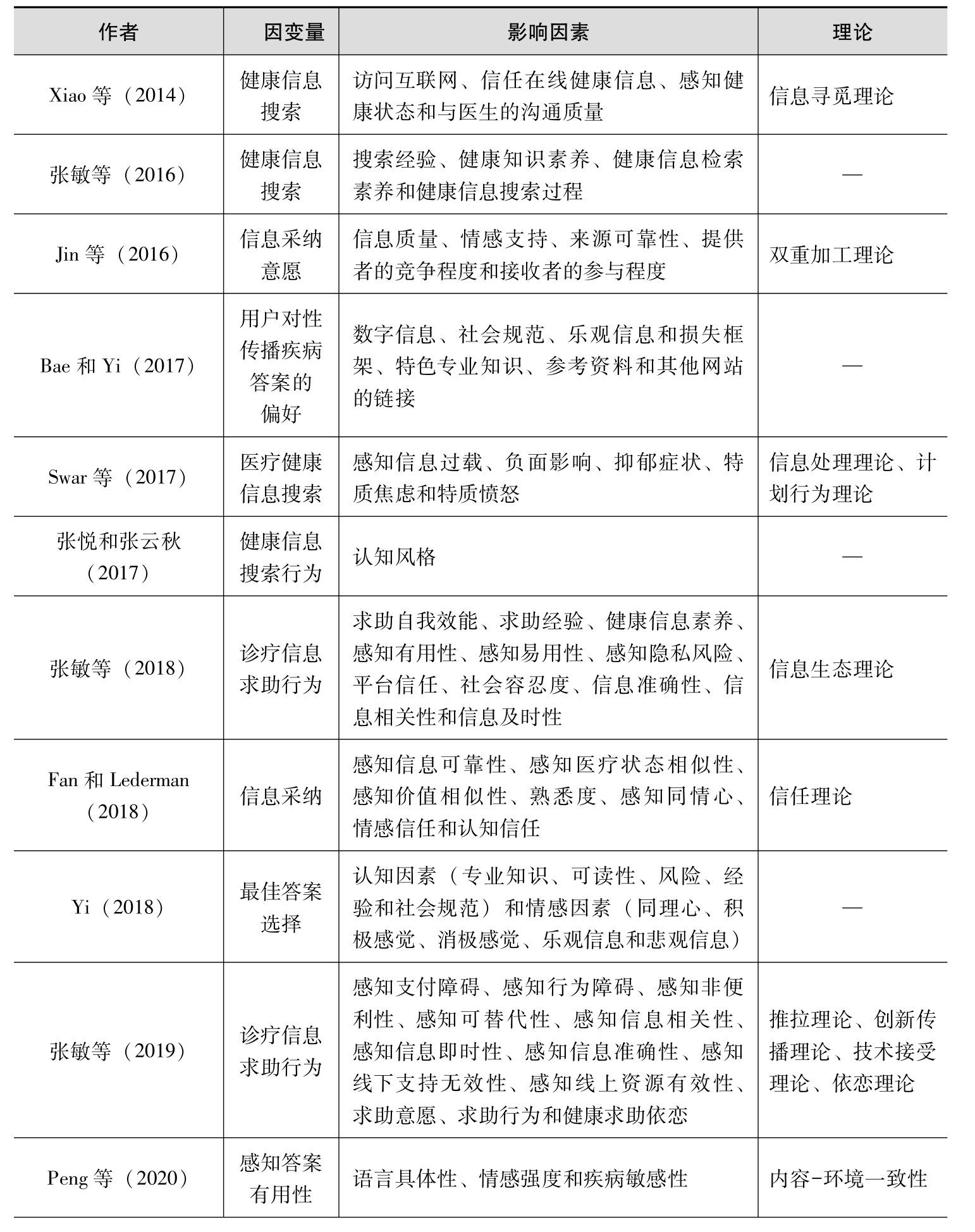 在网络环境下,人们根据自身的健康需求,经常在线寻求医疗健康信息,以达到预防疾病,更多地了解疾病和一般健康知识,并为疾病找到各种治疗选择的目的(Swar et al., 2017)。信息搜索阶段患者行为及其影响因素的相关研究如表2-1所示。可以看出,信息搜索阶段的患者行为主要包括健康信息搜索(Swar et al., 2017;Xiao et al., 2014;张悦、张云秋,2017;张敏等,2016)、健康信息采纳(Fan and Lederman, 2018;Jin et al., 2021;Zhang et al., 2020;Zhou, 2021)和诊疗信息求助(张敏等,2018;张敏等,2019)等。其中,健康信息采纳是指患者在了解健康信息的有效性后,对所接收信息中建议行为的接受程度(Watta and Zhang, 2008)。过去的研究更多是关注用户如何在社会问答社区的医疗版块(Bae and Yi, 2017;Yi, 2018)、医学问答社区(Jin et al., 2016;Peng et al., 2020)和在线患者社区(Fan and Lederman, 2018;Zhou, 2021)中采纳在线健康信息。例如,Jin等(2016)关注了社会问答社区的用户健康信息采纳行为,研究发现,健康信息的信息质量、情感支持和来源可靠性对用户健康信息采纳行为有积极影响,答案的竞争程度正向调节来源可靠性与采纳决策的关系,并且提问者参与程度正向调节信息质量、来源可靠性与采纳决策的关系。Zhou(2021)关注了在线患者社区的用户健康信息采纳行为,研究发现,中心线索(论据质量)和外围线索(来源可靠性和情感支持)同时影响用户信息采纳意愿,自我效能感对中心线索和外围线索与信息采纳意愿之间的关系均有调节作用。Peng等(2020)关注了医疗问答社区的患者信息有用性评价行为,从内容-环境一致性的视角,研究发现问题与答案之间语言具体性、情感强度和疾病敏感性对患者感知信息有用性的影响。