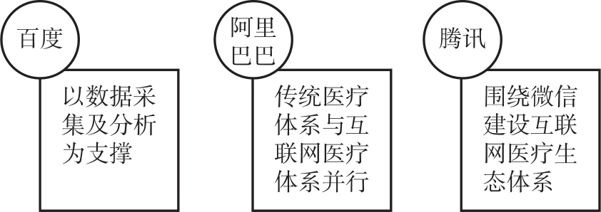 早在10年前,百度、阿里巴巴、腾讯三大网络巨头(BAT)就开始进入互联网医疗领域,百度、阿里巴巴、腾讯显示出各自的优势力量,形成了自己的特色(见图2-3)。