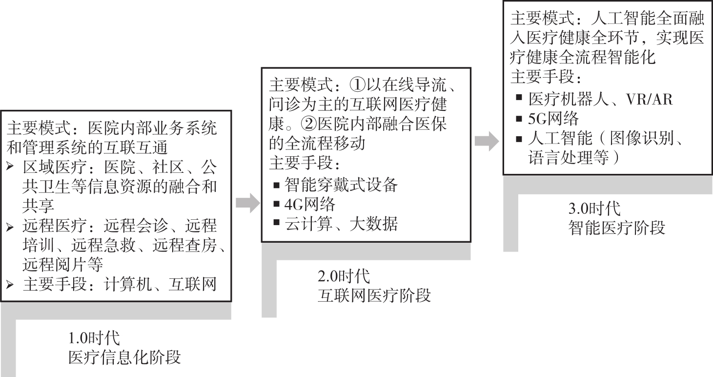 第三个阶段是智能医疗阶段,人工智能技术全面融入医疗健康全环节,借助医疗机器人、虚拟现实、增强现实、5G网络、人工智能等技术,实现人工智能辅助诊断、远程手术等,实现医疗健康全流程智能化。医疗健康信息化的阶段划分,使医疗健康信息化进程十分清晰。但在实际运行中,互联网医疗和智能医疗是难以分割的,处于融合发展状态。可以说,智能医疗是互联网医疗的延伸和发展,同属于互联网医疗。例如典型的互联网医院,既有互联网医疗技术运用,也有智能医疗技术的运用。