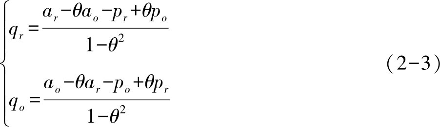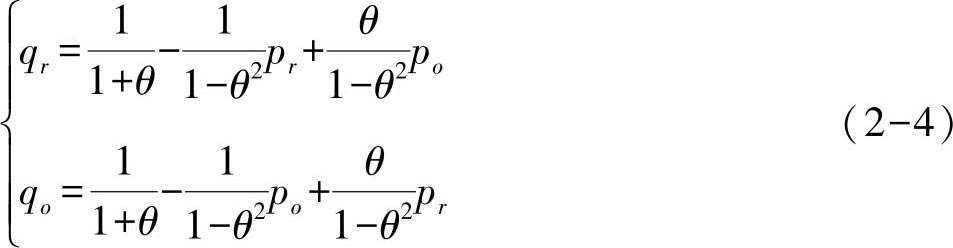 其中, q i ( i ∈{ r , o })表示 i 渠道的销售量; a i ( i ∈{ r , o })表示 i 渠道的市场潜在需求; p i ( i ∈{ r , o })为 i 渠道产品销售价格。 θ 表示两个销售渠道间的竞争强度, θ 越大表示渠道间竞争越激烈。若 θ →0,则表示两个销售渠道间竞争较弱,此时零售商和平台商或制造商近似为各自终端渠道市场的垄断者;随着 θ 增大,下游市场竞争逐渐加剧,当 θ →1时,表示两个销售渠道之间的竞争十分激烈。