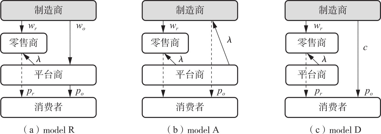 三种销售模式属于三种不同的销售渠道,其相互之间既有联系也有区别。三种销售模式之间的联系:三者均为网上销售渠道并将制造商产品销售到终端消费者手中。三种销售模式之间的主要区别在于产品的定价权、收益分配和渠道构建成本。代售模式下决策者直接将产品销售给终端消费者并决策零售价格,但需分出部分比例的收入充当许可费;分销模式下决策者将产品以批发价格销售并决策批发价格,而零售价格的决策者为下游零售商;直销模式下决策者直接将产品销售给消费者并决策零售价格,但需要付出构建网上交易平台的成本。现实中企业案例表明:制造商三种销售模式情形均存在,而零售商只有代售模式和直销模式两种情形。平台商一般不会选择从零售商处采购商品,这是因为经过零售商加价后的产品价格高于直接从制造商处采购的产品价格。