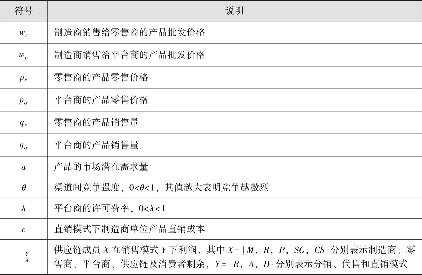 本章考虑由一个制造商、一个零售商和一个平台商组成的线上零售供应链。其中,平台商既作为一个双边匹配平台为零售商和消费者提供服务,也可以作为零售商分销制造商的产品。零售商在平台商提供的交易平台上销售产品并支付一定的许可费。在实际企业经营中,平台商和零售商之间达成的是收益共享合同,其收取的许可费为零售商销售收入的一定比例,这一收费方式亦在诸多文献中得到运用 [45,53-56] 。同时,在零售商销售渠道之外,制造商亦选择开通双渠道。则此时制造商有三种销售模式可供选择:将产品销售给平台商(分销模式)、在平台商的网上交易平台上开设旗舰店(代售模式)、自己构建网上交易平台(直销模式)。