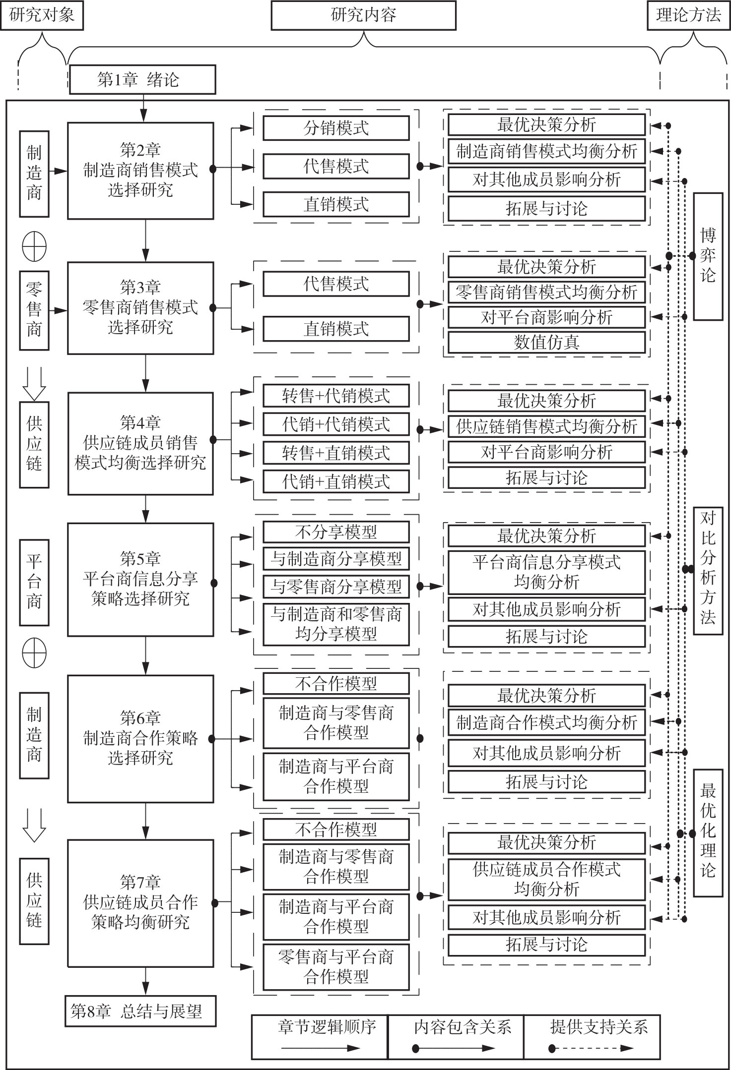 本书总结和归纳已有研究文献,运用供应链管理理论、产业组织理论、博弈论、最优化理论、概率论和数理统计等相关知识,在理论分析的同时,首先利用数理方法构建Stackelberg博弈模型,其次采用逆向求解法并借助Mathematica、Maple、Matlab等工具进行求解和图形分析,最后通过定性与定量相结合的方法对模型均衡解进行对比分析,得出最优模式选择。