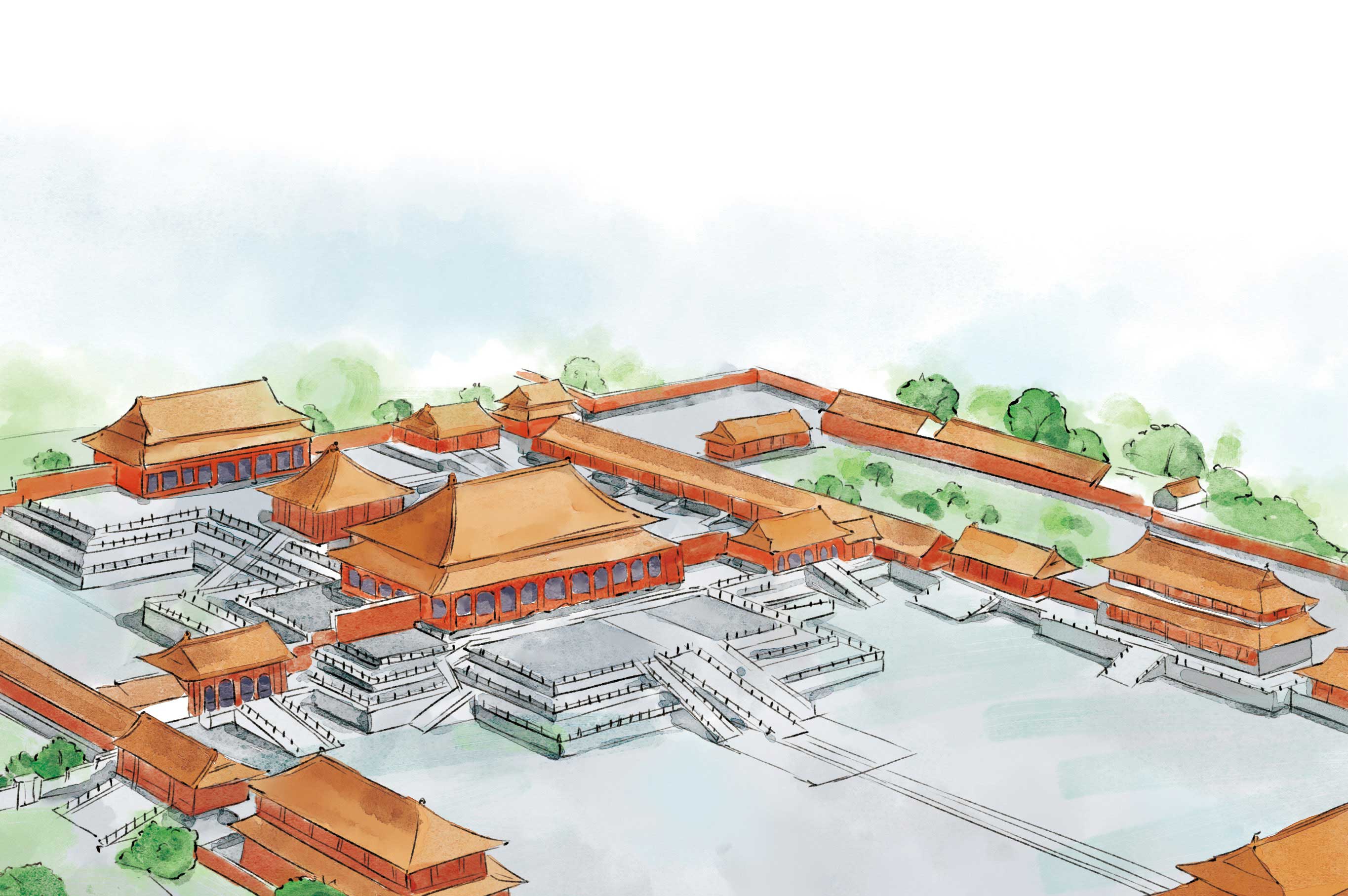 前朝正中的三大殿是宫中前部的重点,阶陛三层,结构崇伟,为建筑造型的杰作。东侧是文华殿,西侧是武英殿,这两组与太和门东西并列,左右衬托,构成三殿前部的格局。