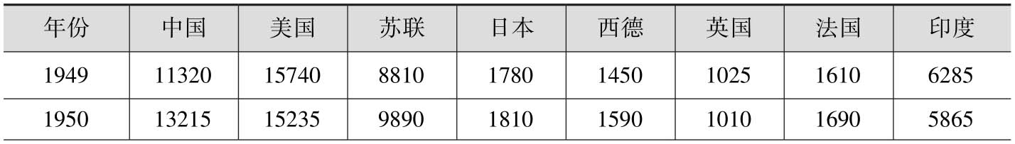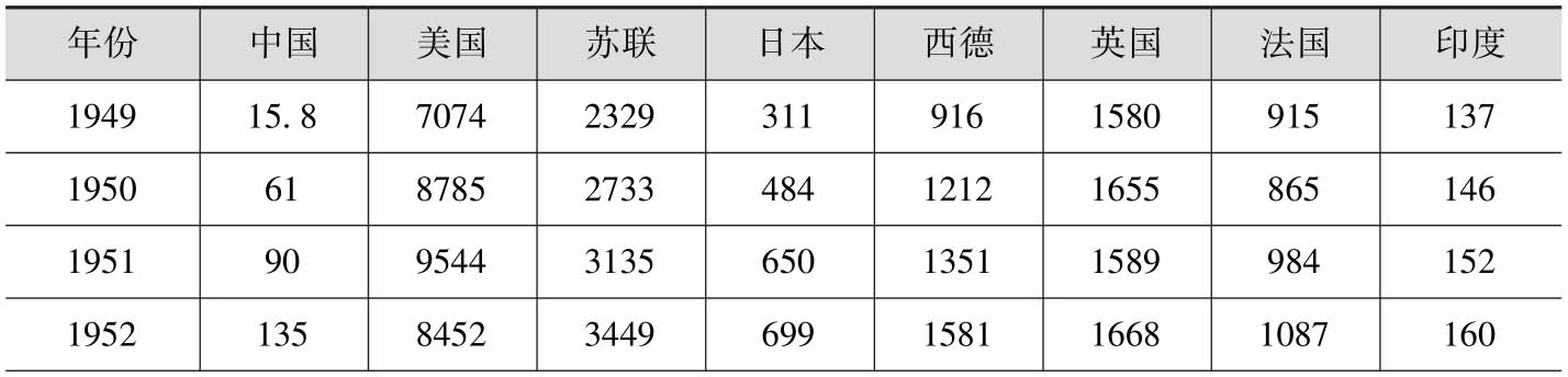 中国自古就是农业大国,并且在进行土地改革以后,农民的生产积极性得到极大激发,粮食产量取得了不小成果。从图3-1中可以看出,从新中国成立后至完成土地改革以前,中国的粮食产量较当时世界上其他国家都是十分具有优势的。但是对于刚刚新生的国家来说,中国有着十分急迫的愿望——达到工业化战略目标,而一国主要工业产品产量意味着该国工业基础的实力。就钢产量而言,中国和世界上其他国家相比还相去甚远。如图3-2所示,1949年新中国成立之初的钢产量为15.8万吨,1952年我国的钢产量为135万吨,而同一时期的其他国家钢产量与我国形成了较为显著的对比,其中钢产量最低的印度1949年的钢产量为137万吨,竟略高于我国1952年135万吨的成绩。而在1952年,我国的煤炭产量为6600万吨,同等时间点下,美国和苏联的煤炭产量分别为46033万吨和30088万吨(见图3-3)。因此,要实现工业化目标,我国当时的生产力水平还远远不足。