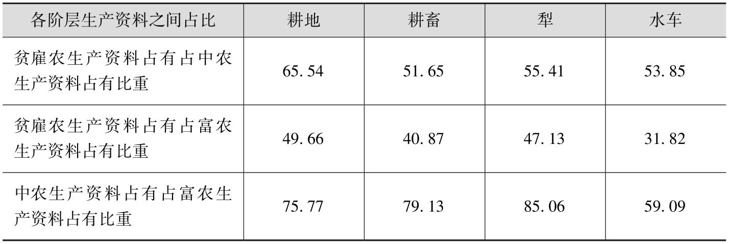 (1)劳动互助时期:经过土地改革后农村生产力有所提高,但由于改革造成生产资料的不适配等问题,农村生产力仍难以大力发展。如表3-4所示对23个省的调查结果显示,土地改革结束时,在15432户农户中,贫雇农户均占有耕地数12.46市亩,拥有耕畜0.47头,犁0.41张,水车0.07部;中农户均占有耕地19.01市亩,拥有耕畜0.91头,犁0.74张,水车0.13部;富农情况稍微好一点,但占有情况也并不十分宽裕,耕地占有25.09市亩,耕畜超过1头,户均1.15头,犁只拥有0.87张,水车0.22部(见表3-4)。从以上数据可以看出,农民整体的生产资料占有情况不佳,但贫雇农占有的生产资料尤其缺乏。表3-5中贫雇农生产资料占有占中农、富农生产资料占有比重更能直观反映出这一观点。
