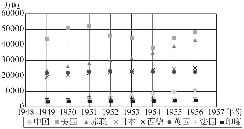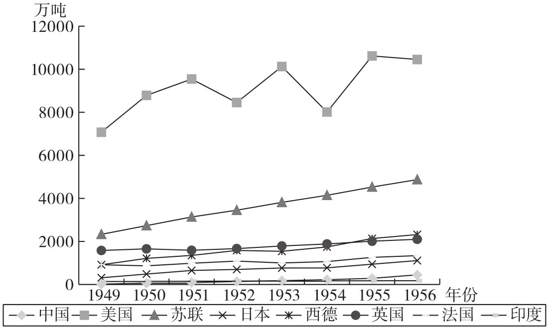 图3-7 1949—1956年中国和世界其他国家煤炭产量对比