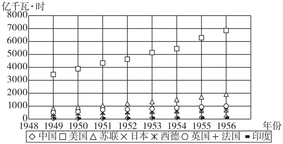 图3-8 1949—1956年中国和世界其他国家发电量对比