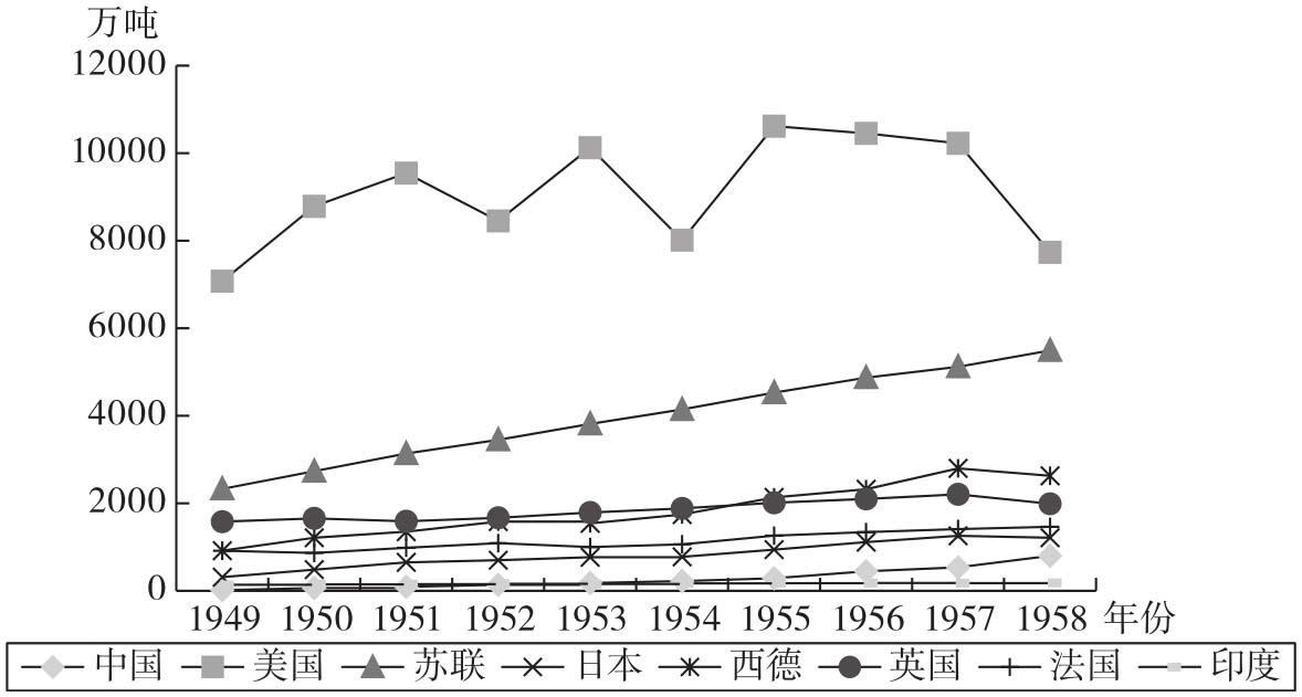 图3-9 1949—1958年中国和世界其他国家钢产量对比